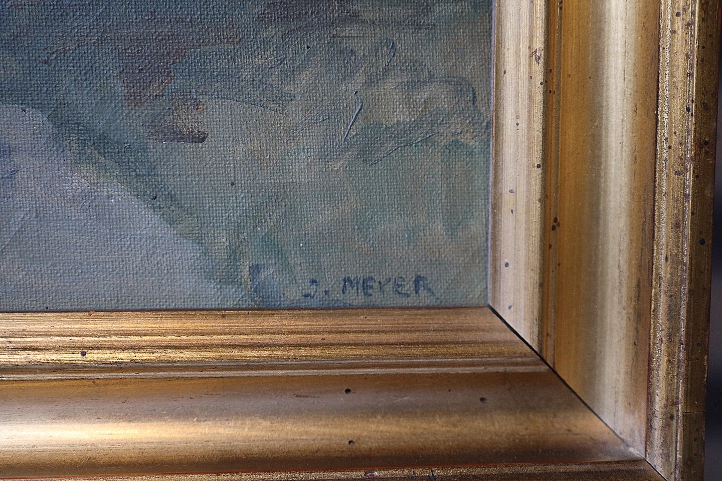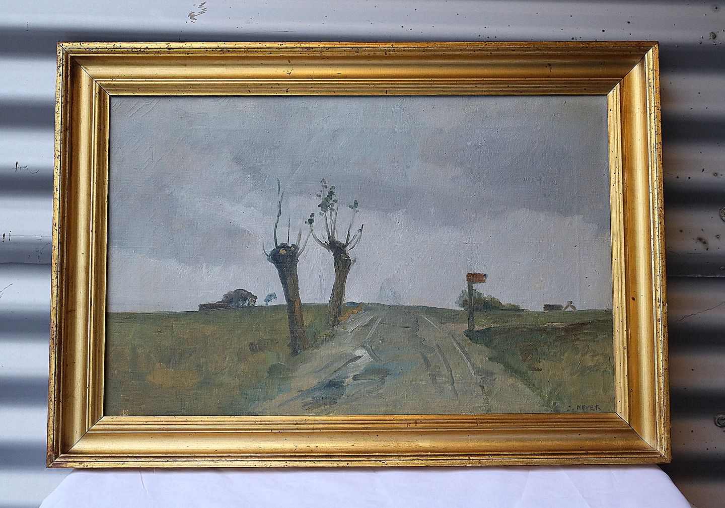 Maleri, Jacob Meyer (1985-1971). Kig ud over en Allé med 2 døde træer og 1 postkasse. Maleriet er signeret J. Meyer. Maleriet er i guldramme, rammen har enkelte brugsspor