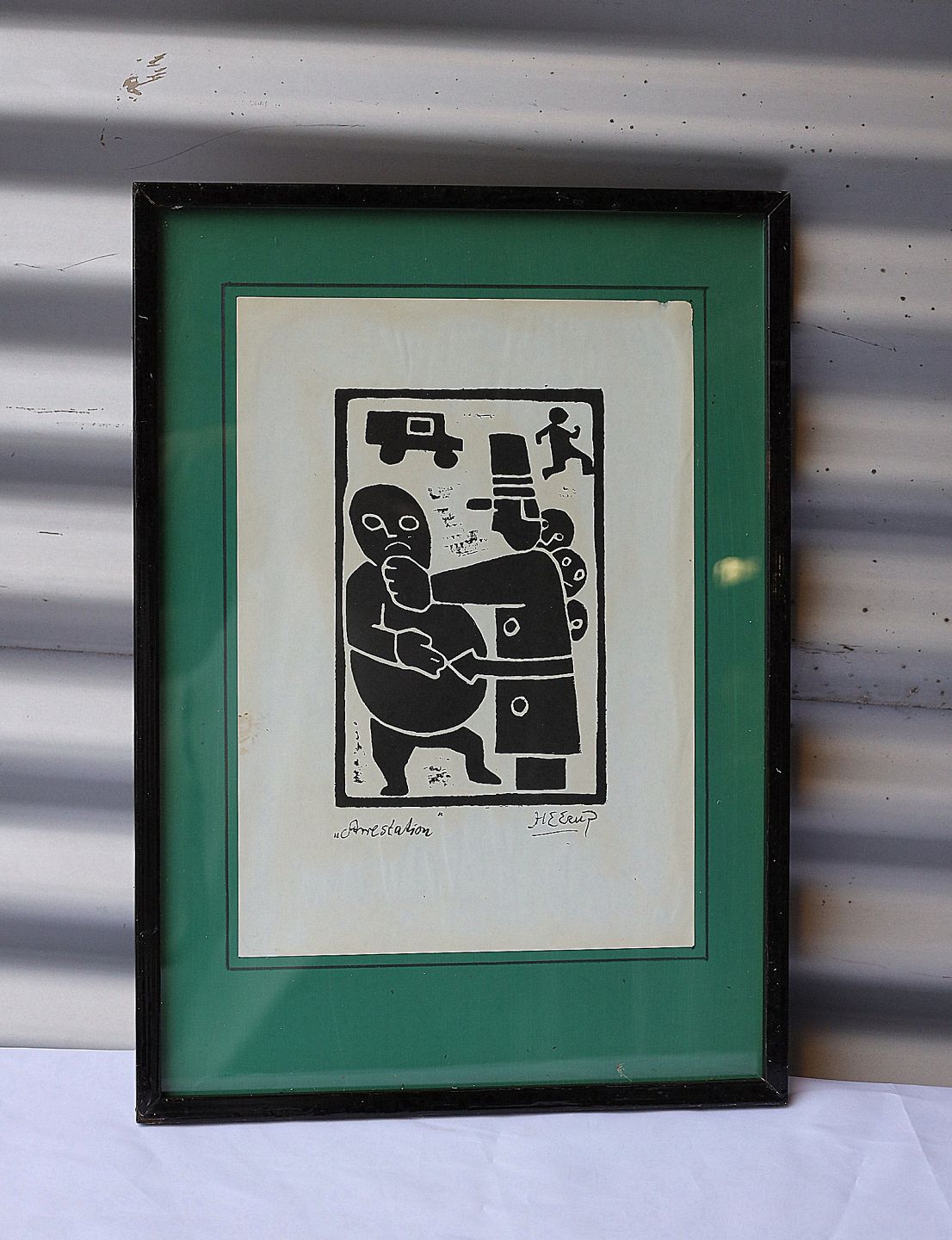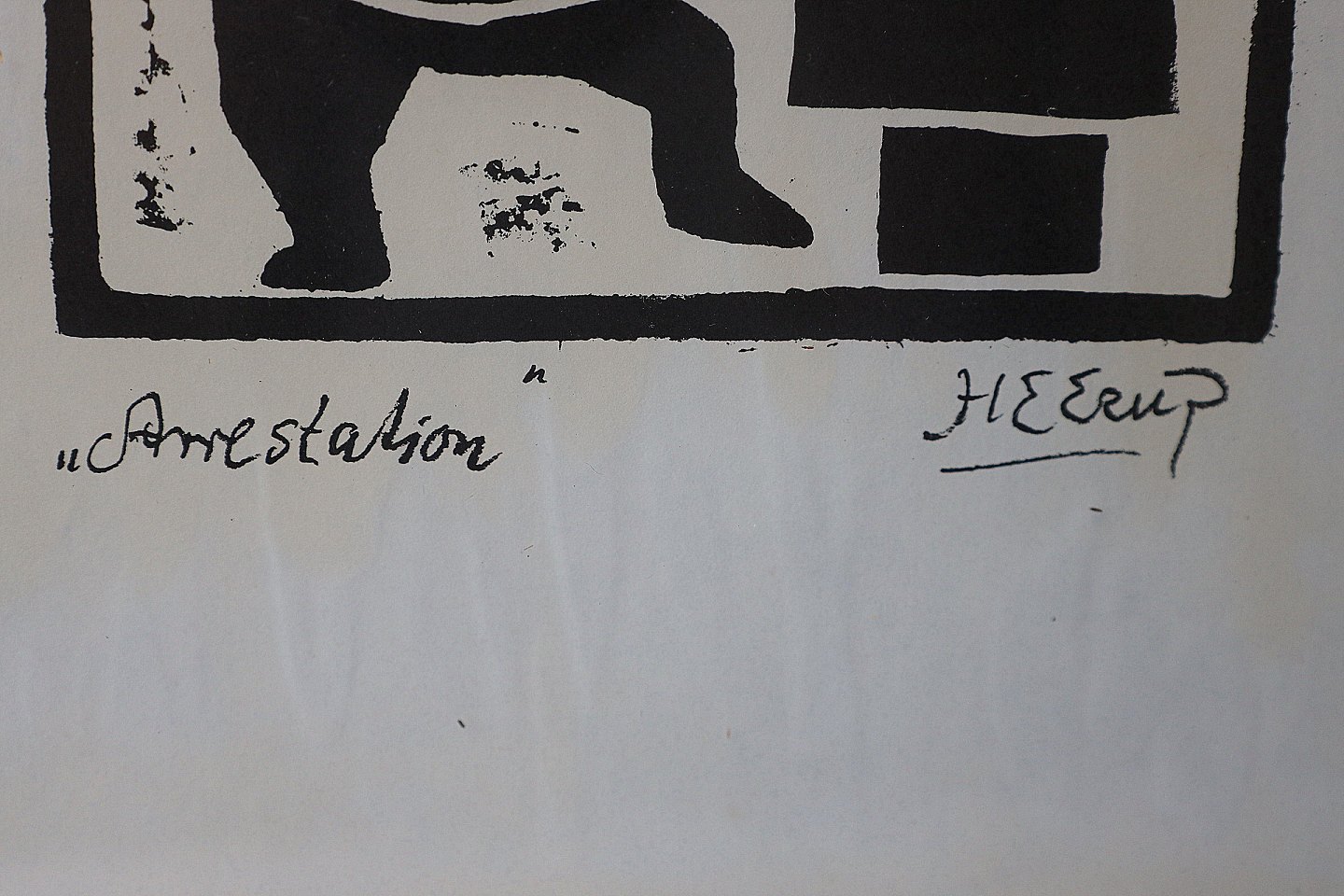 Tryk, Henry Heerup (1907-1993). Tryk, med titlen " Arrestation". Trykket er i sort bejdset ramme.