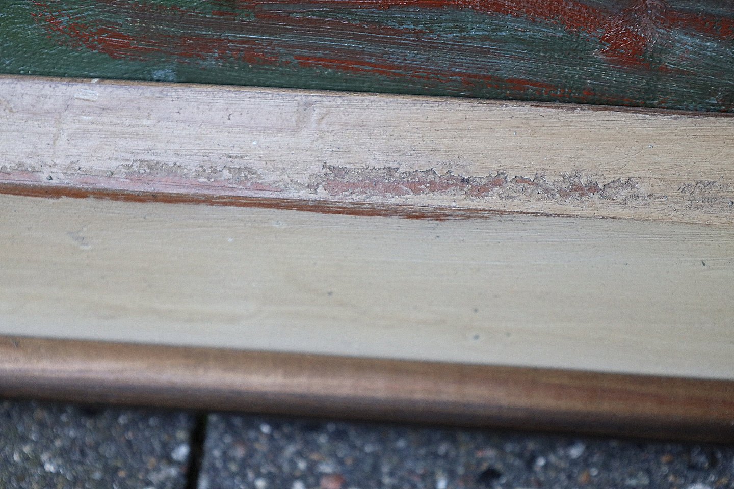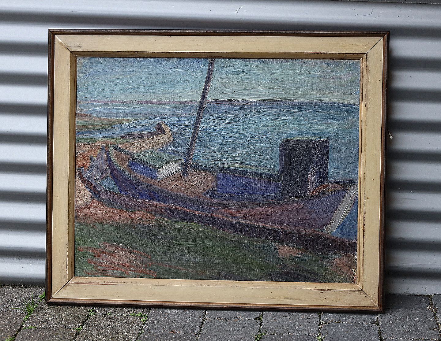 Maleri, ukendt kunstner. Skib der ligger til kaj. Maleriet er i bemalet træramme, der har enkelte brugsspor. Maleriet er usigneret.