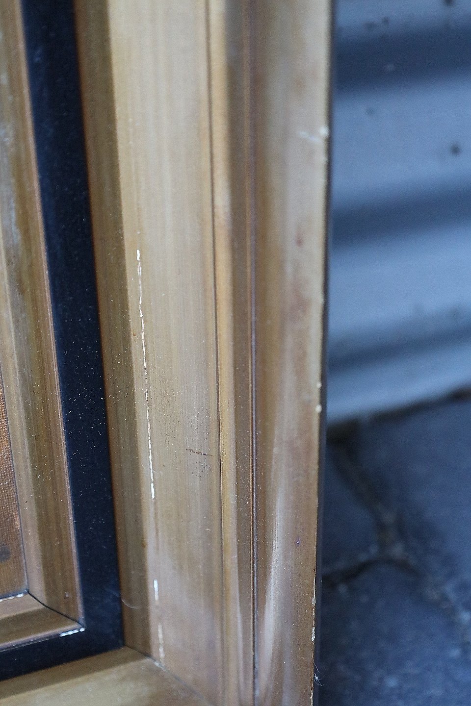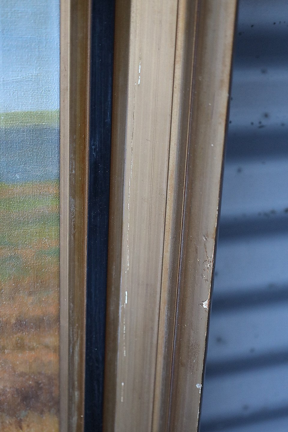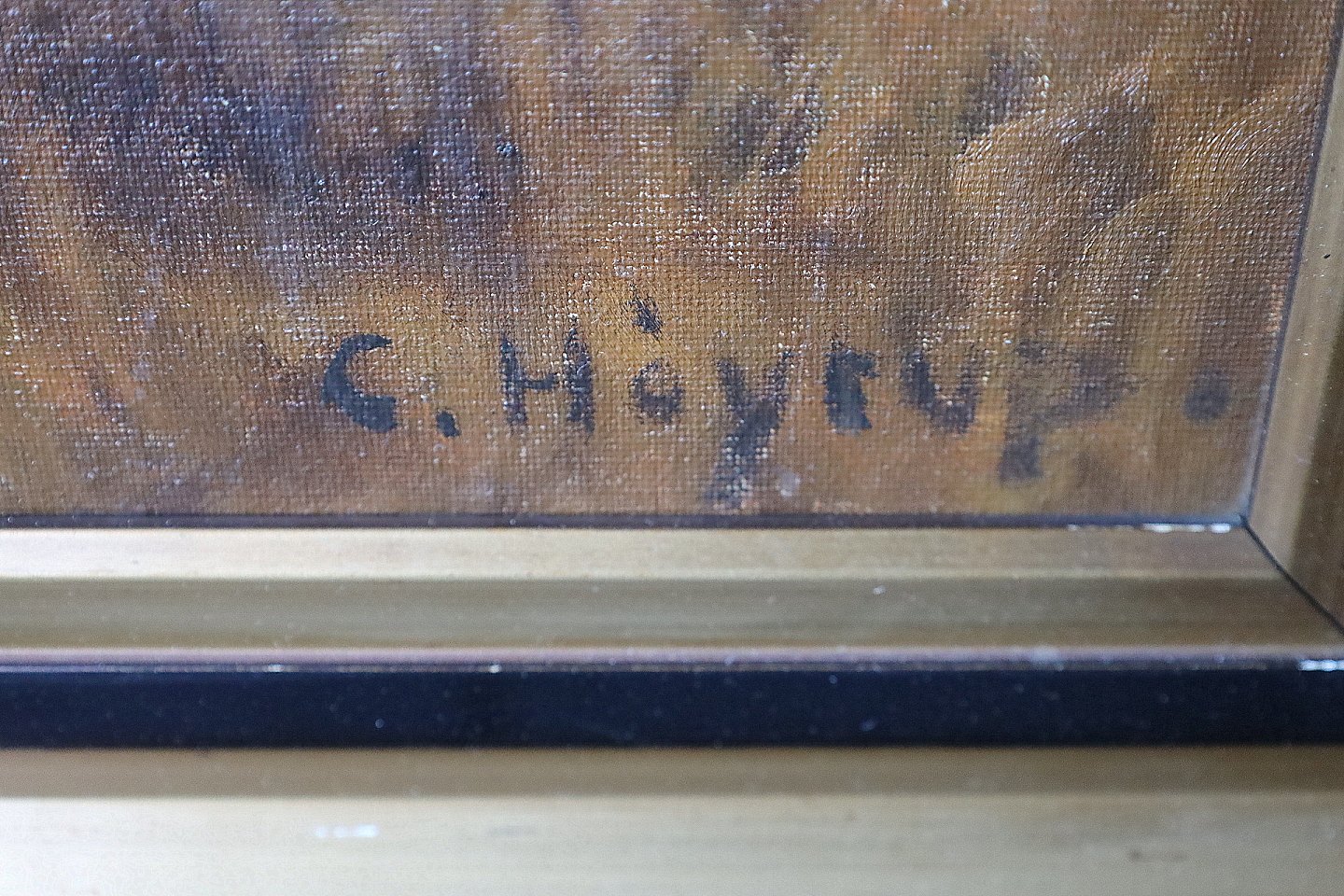Maleri, Carl Høyrup (1893-1961). Gæs der går mellem græs og vand. Signeret C. Høyrup. Maleriet er i guldramme med sort kant, rammen har brugsspor