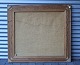 Maleri i pastelfarver, der er hus i forgrunden og bjerge i baggrunden. Maleriet er i en mørk ramme med enkelte brugsspor.