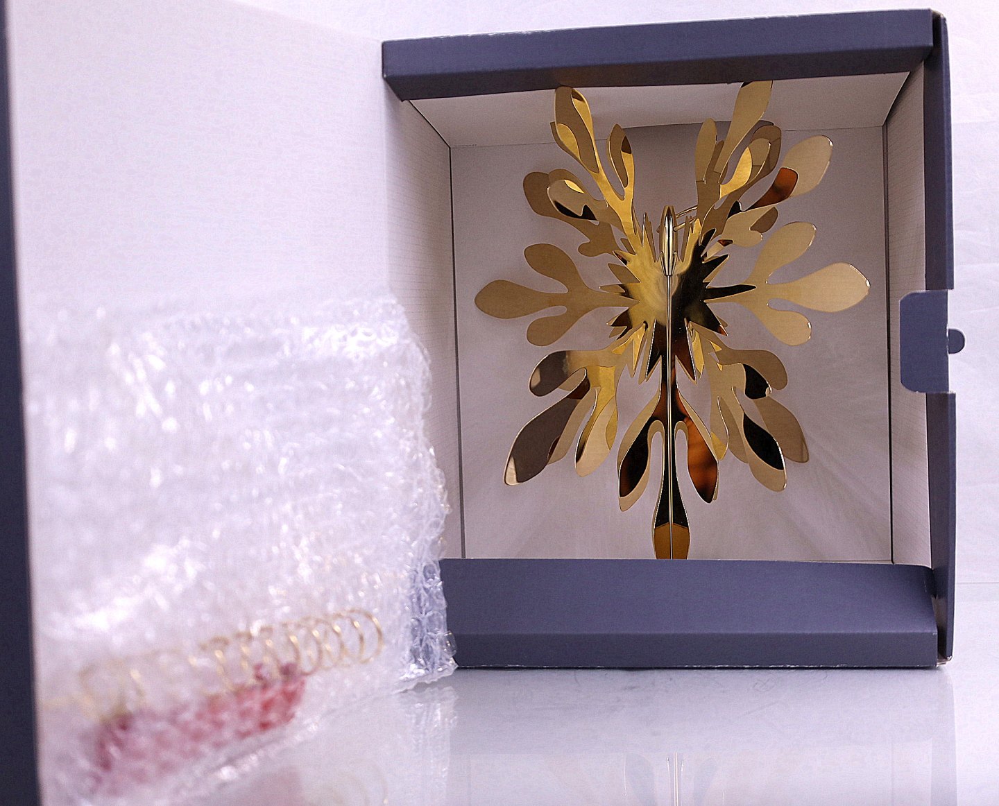 Georg Jensen. Kronblad topstjerne 2016, topstjernen kan både sættes på toppen af juletræet eller hænge. Kronblad topstjernen er stor størrelse. Topstjernen er messing belagt med 18 karat guld, og kommer i original æske, der er også et rødt ubrugt bånd med, der følger juletræs holder med.