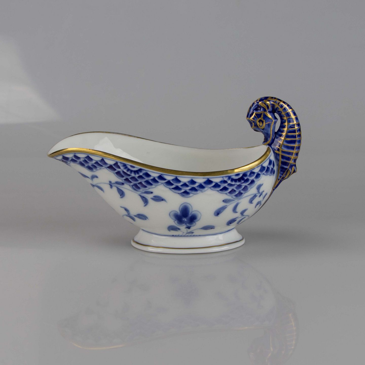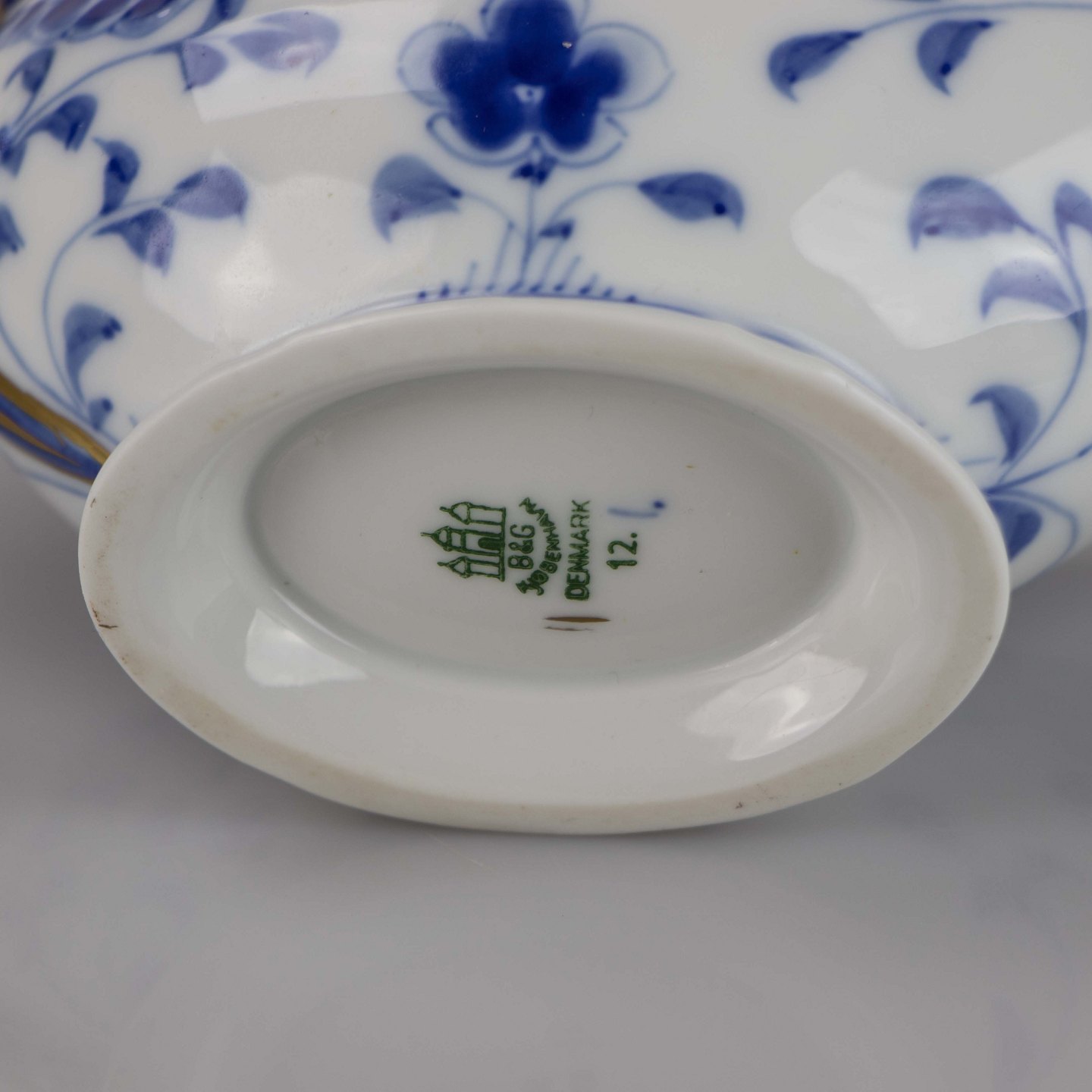 Smørnæb i hvidt porcelæn med guldkant med blå motiver af blomster og sommerfugle.