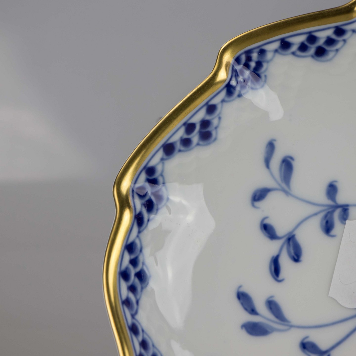 Fad i hvidt porcelæn med guldkant med blå motiver af blomster og sommerfugle.