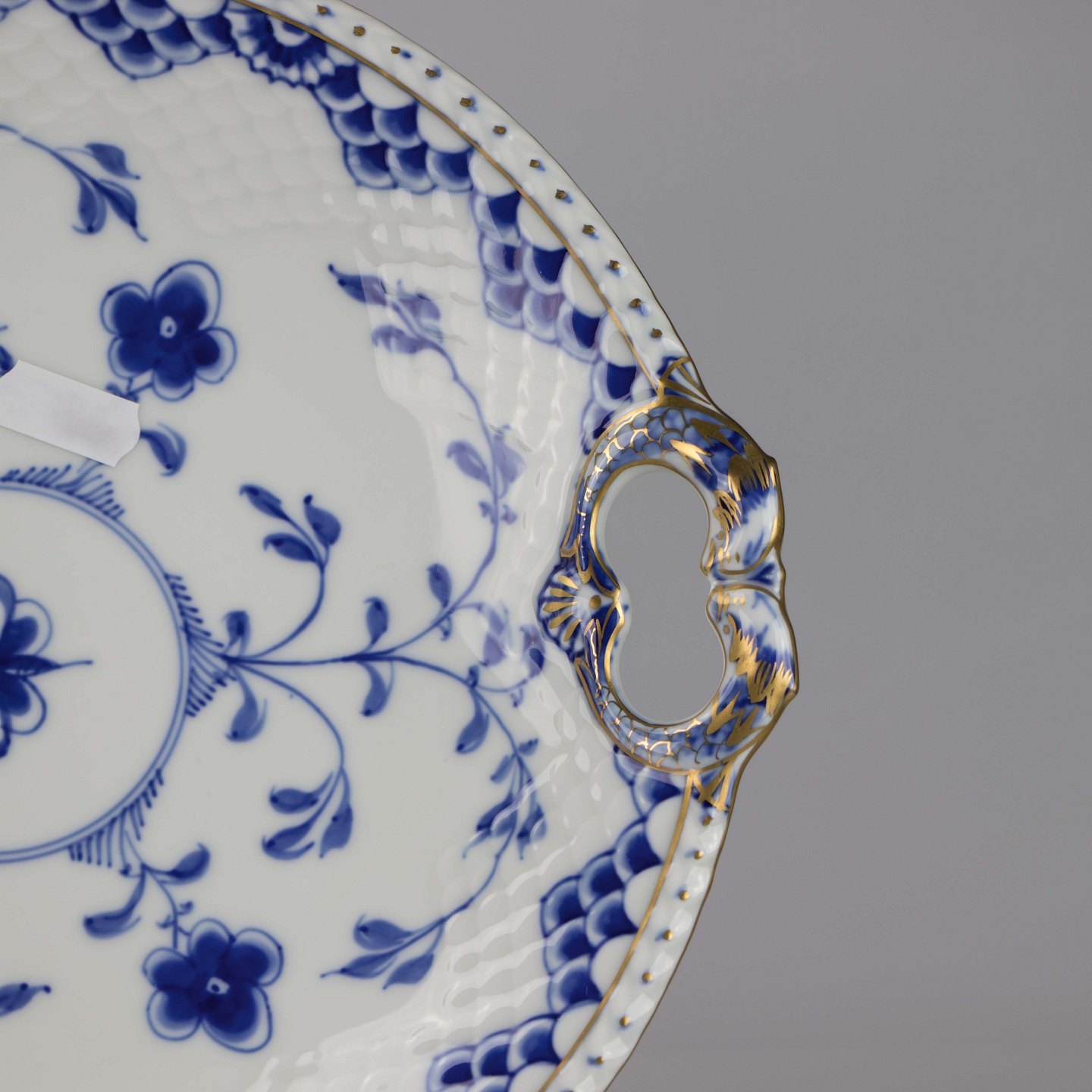 Fad i hvidt porcelæn med guldkant med blå motiver af blomster og sommerfugle.
