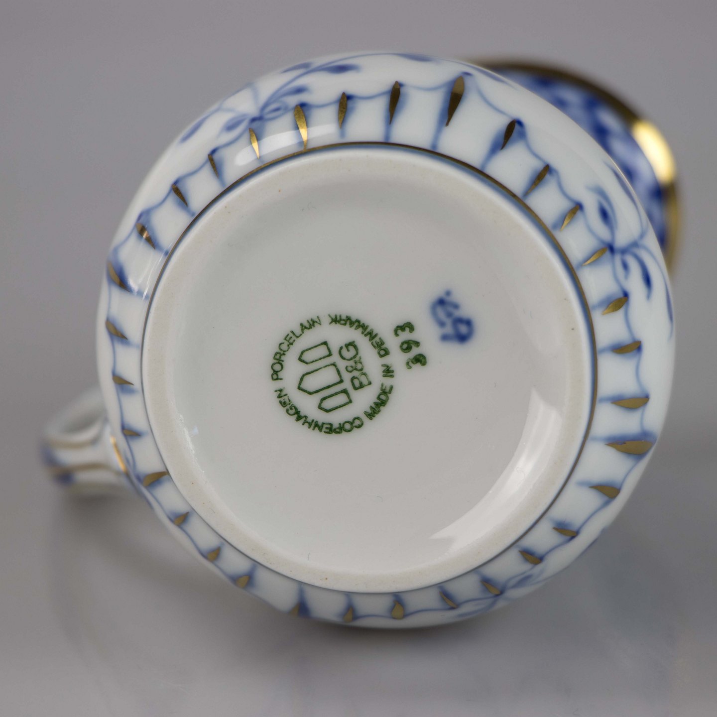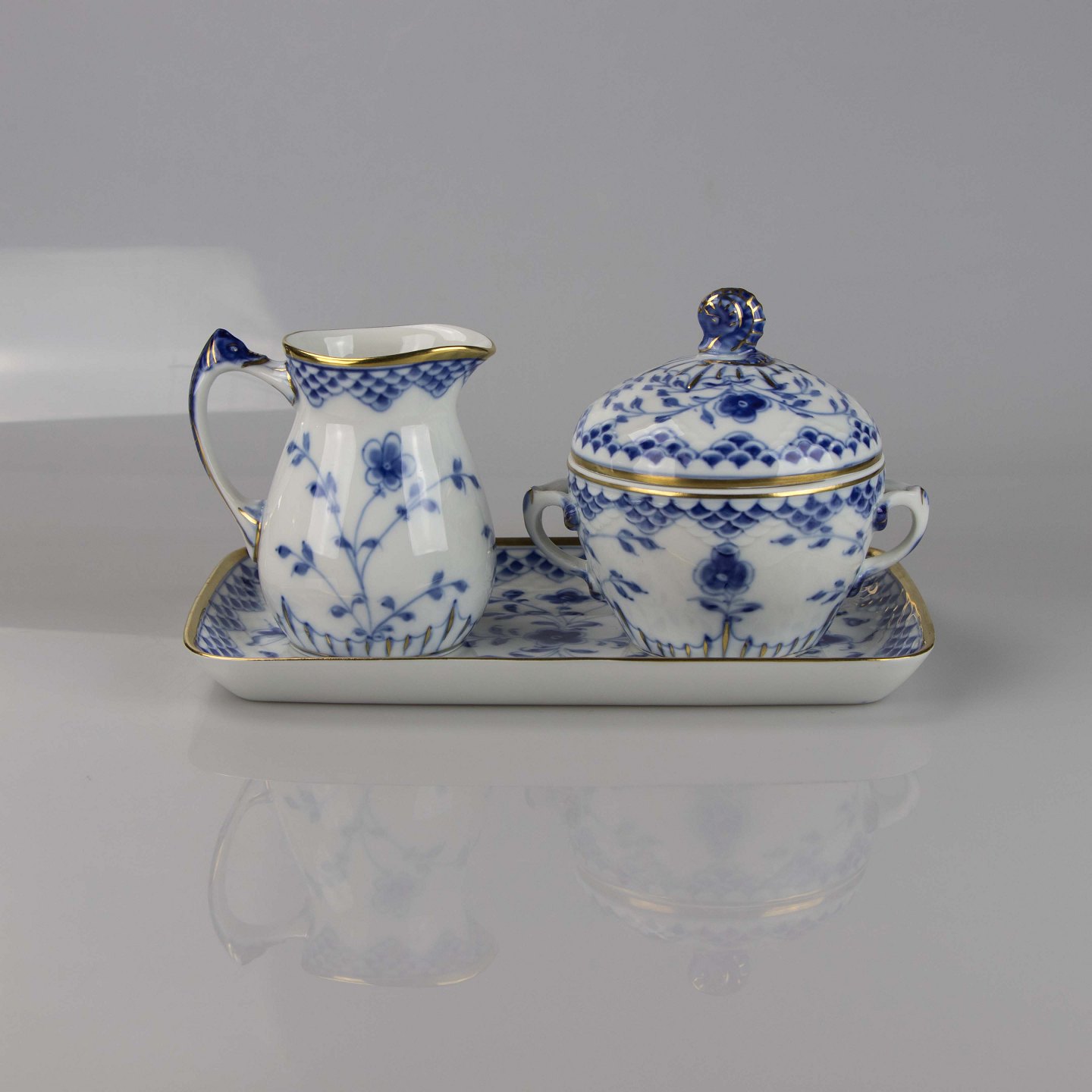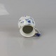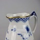 Kande i hvidt porcelæn med guldkant med blå motiver af blomster og sommerfugle.