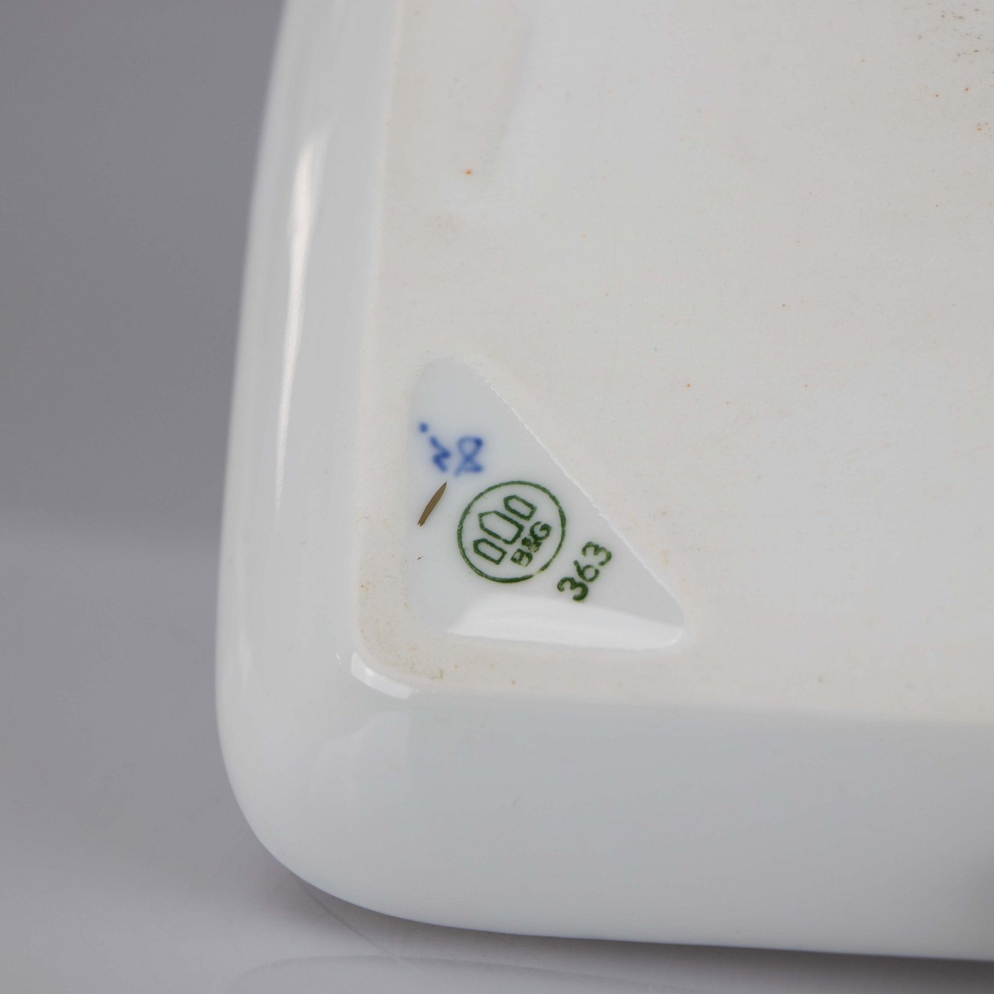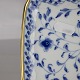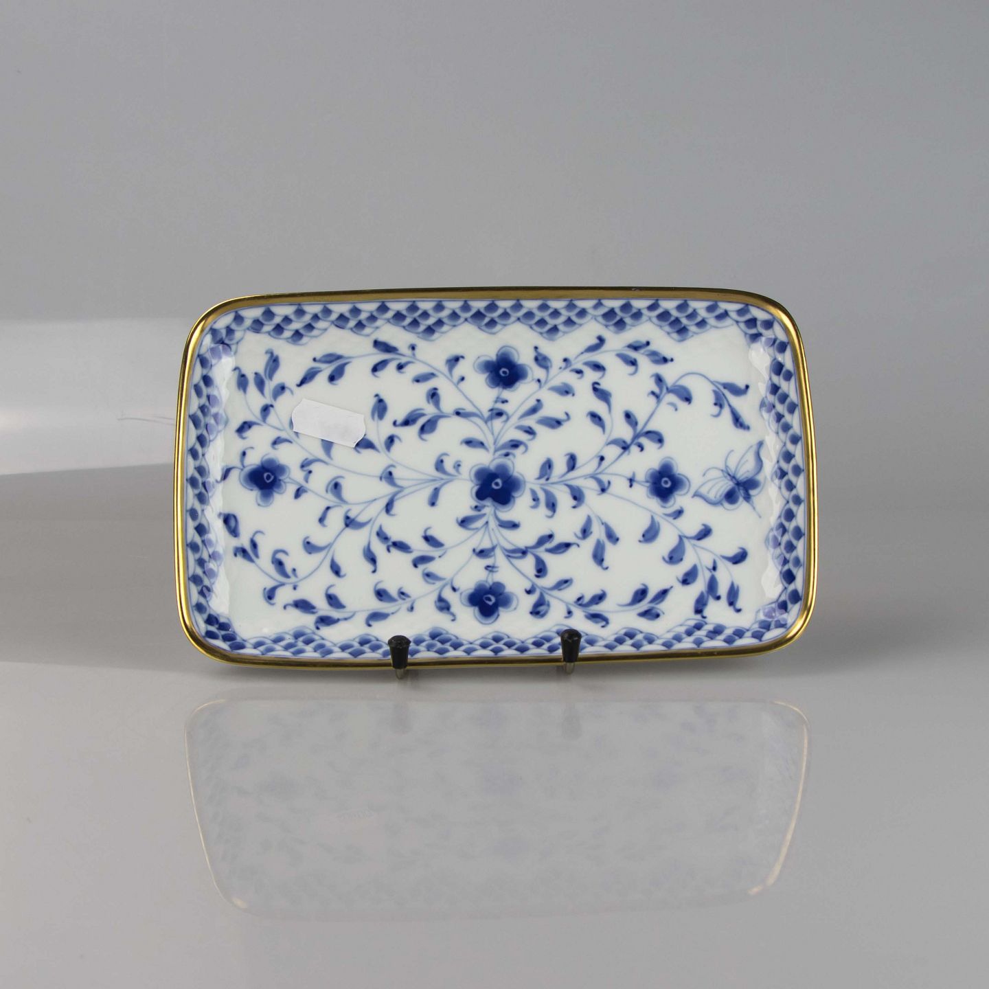 Fad i hvidt porcelæn med guldkant med blå motiver af blomster og sommerfugle.