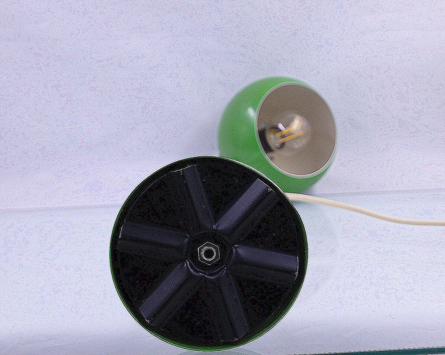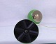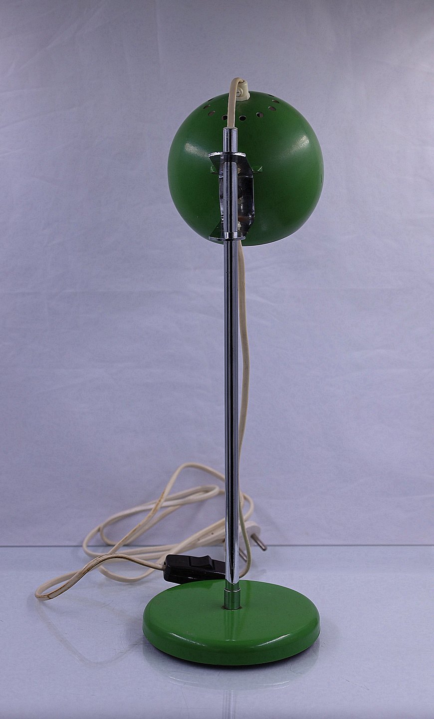 Grøn bordlampe, kuglemodel. Lampen er af metal, grønlakeret yderst og på lampefod, hvidlakeret inderst. Stammen er forniklet metal. Kuglehovedet kan justeres via en klips på stammen