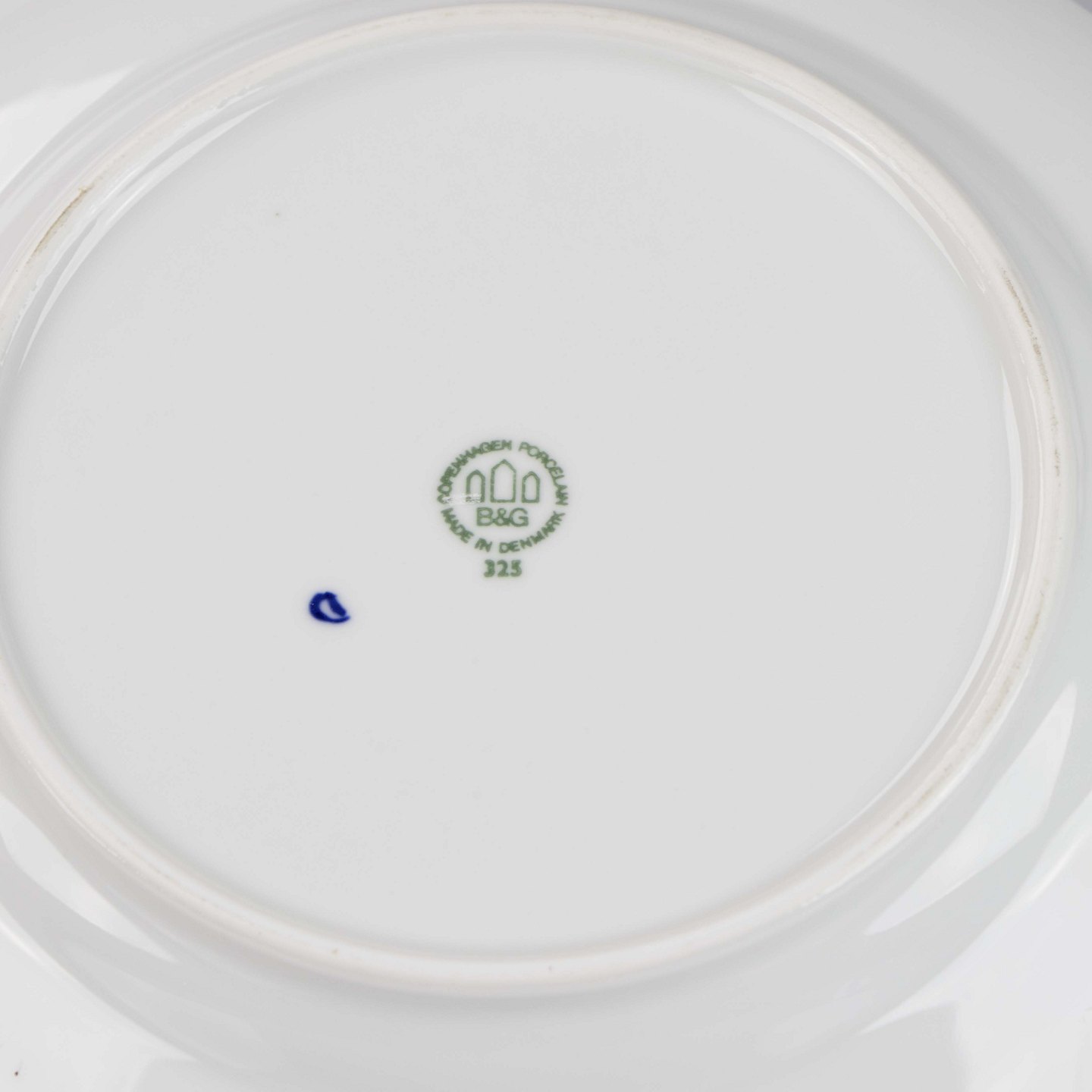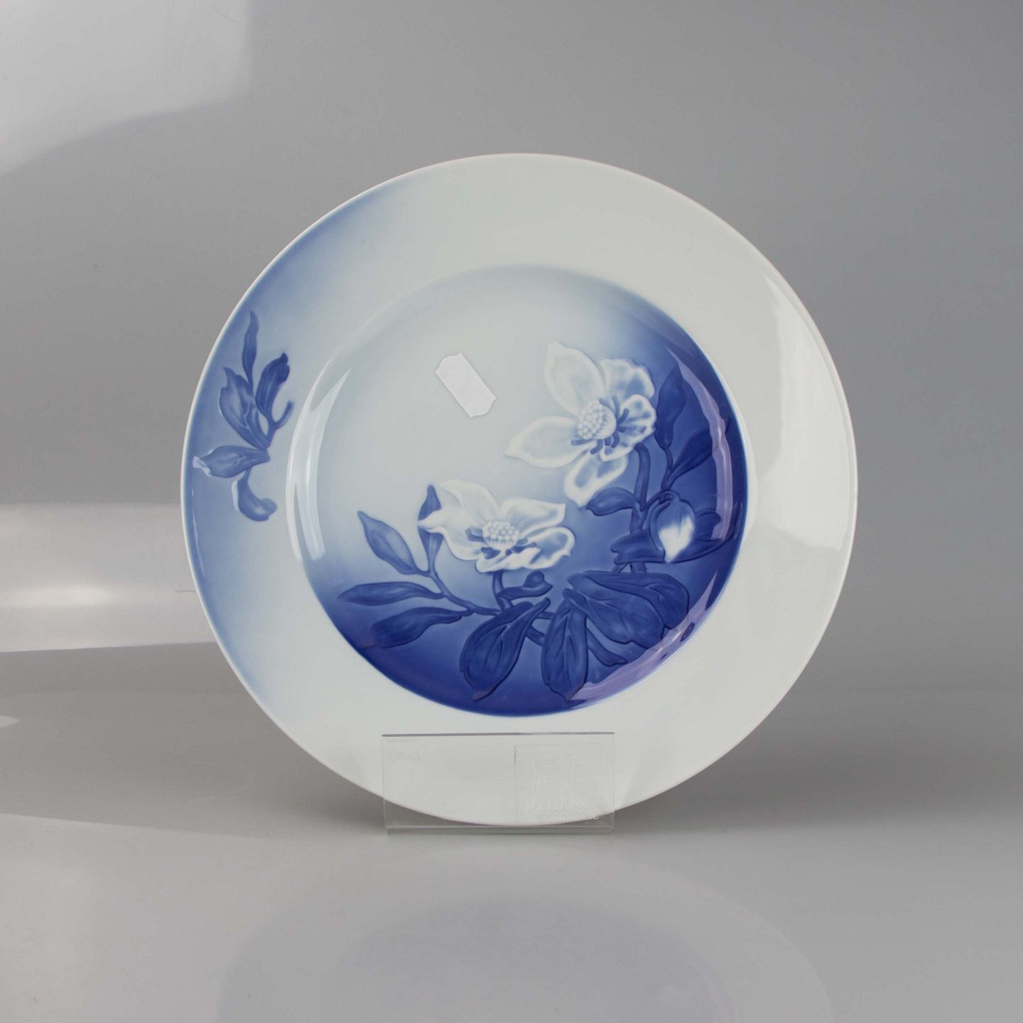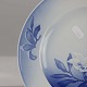 Flad tallerken i hvidt og gradueret blå porcelæn med motiv af julerose.