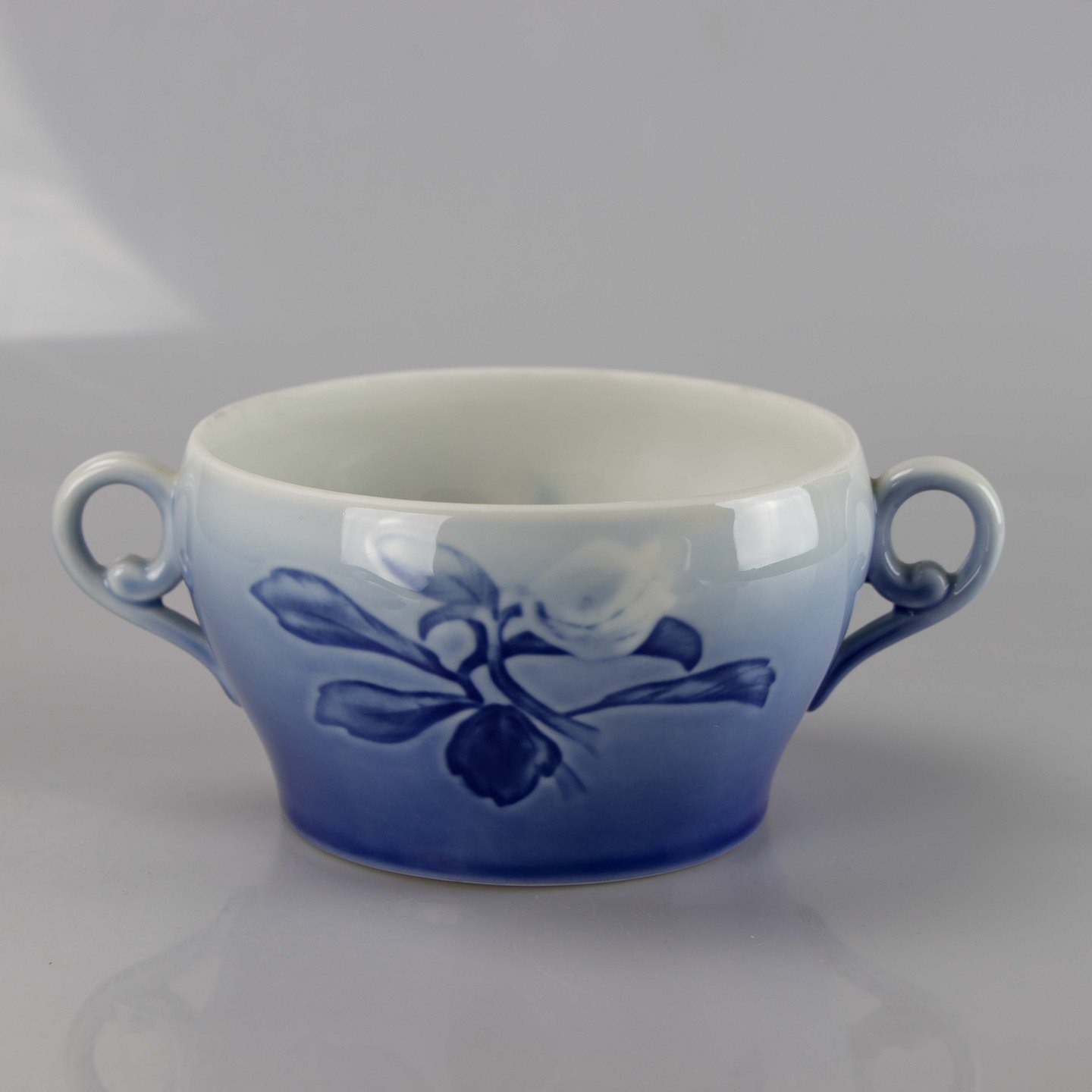Lågkrukke i hvidt og gradueret blå porcelæn med motiv af julerose.