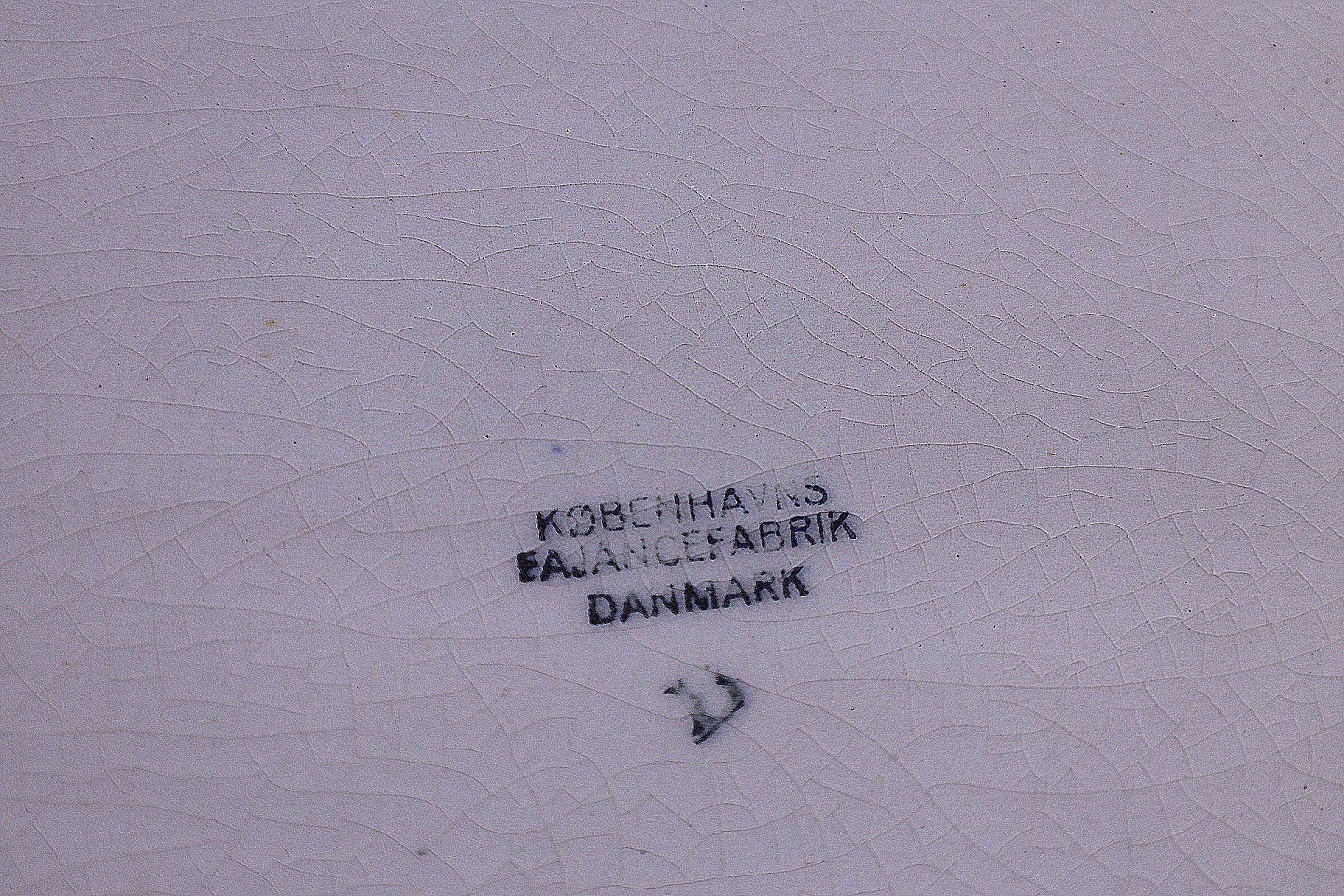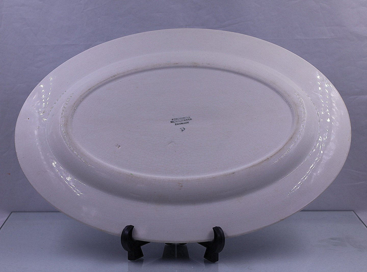 Københavns Fajancefabrik/Aluminia 1923-1940. Ovalt serveringsfad fra Påfuglestellet. Fadet er af fajance. Dekorationen er af Oskar Willerup. Der er ingen brugsspor på serveringsfadet