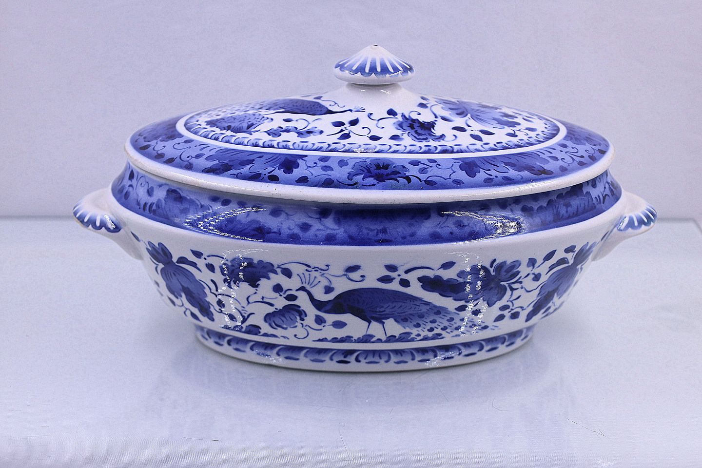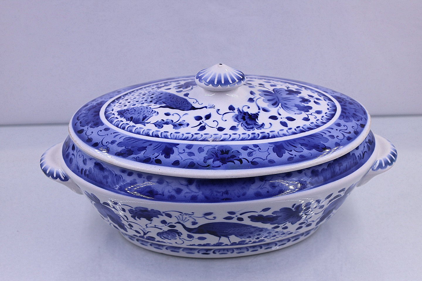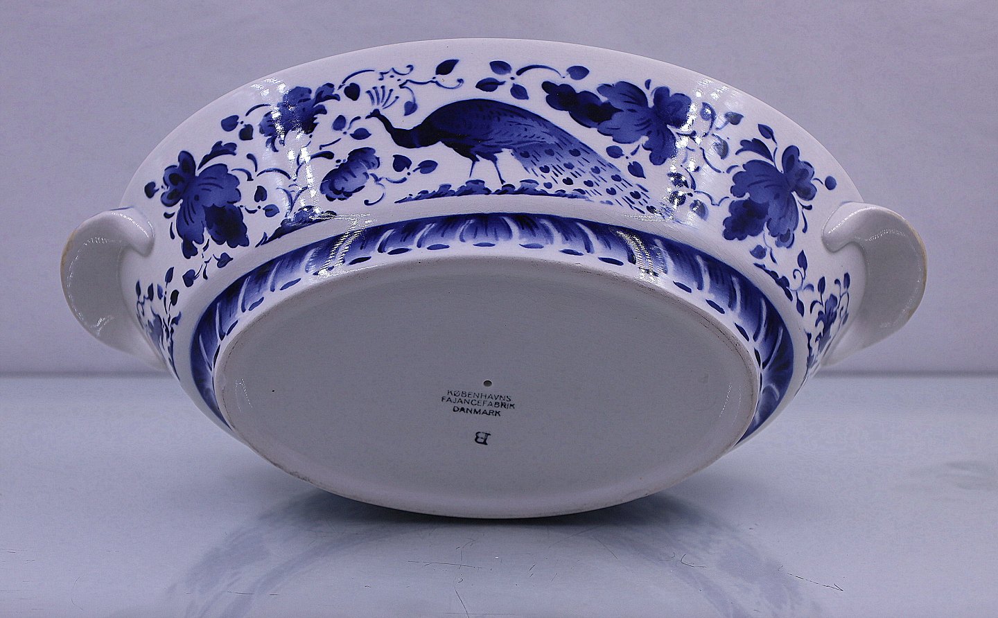 Københavns Fajancefabrik/Aluminia 1923-1934. Ragoutfad med låg fra Påfuglestellet. Ragoutfadet er af fajance. Dekorationen er af Oskar Willerup. Der er ikke brugsspor på ragoutfadet