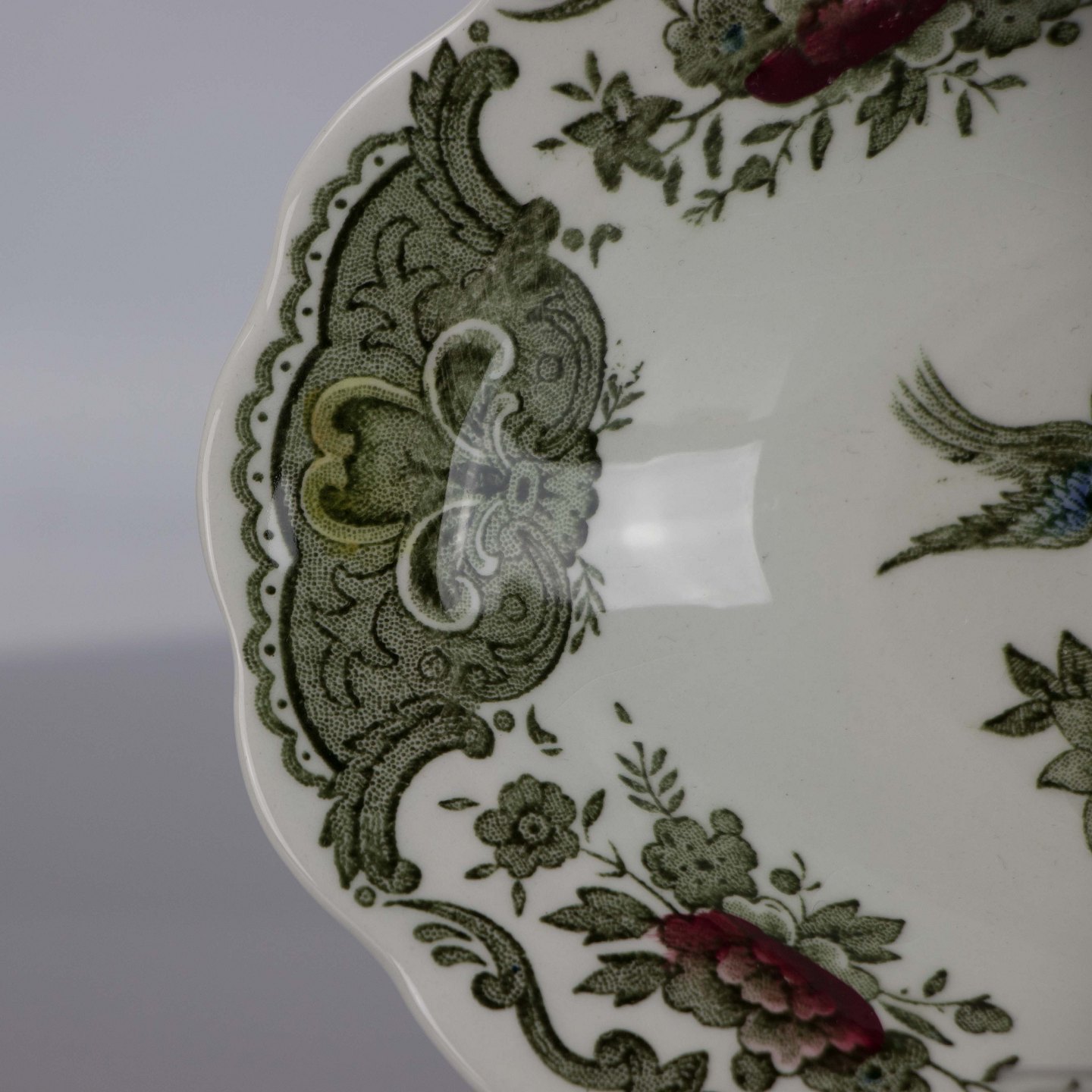 Fad i hvid fajance med multifarvet motiv af blomster og fugle.