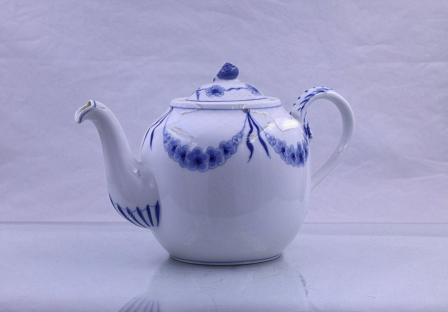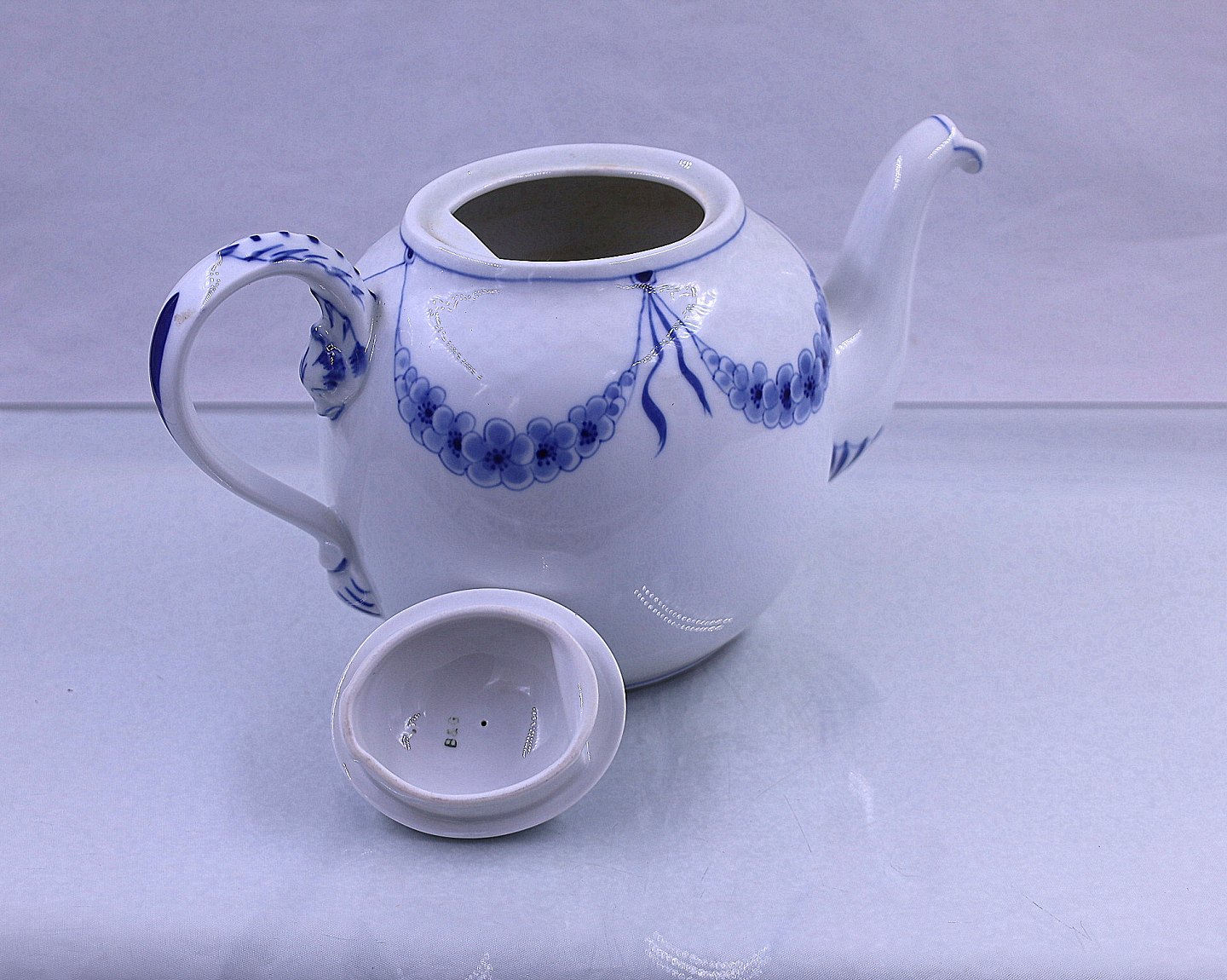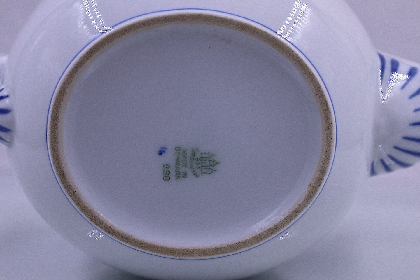Bing & Grøndahl. Empire Thekande nr. 238, thekanden er oval. Empire er hvidt med skælborter og svungne blomster dekorationer. Thekanden har brugsspor indvendig.