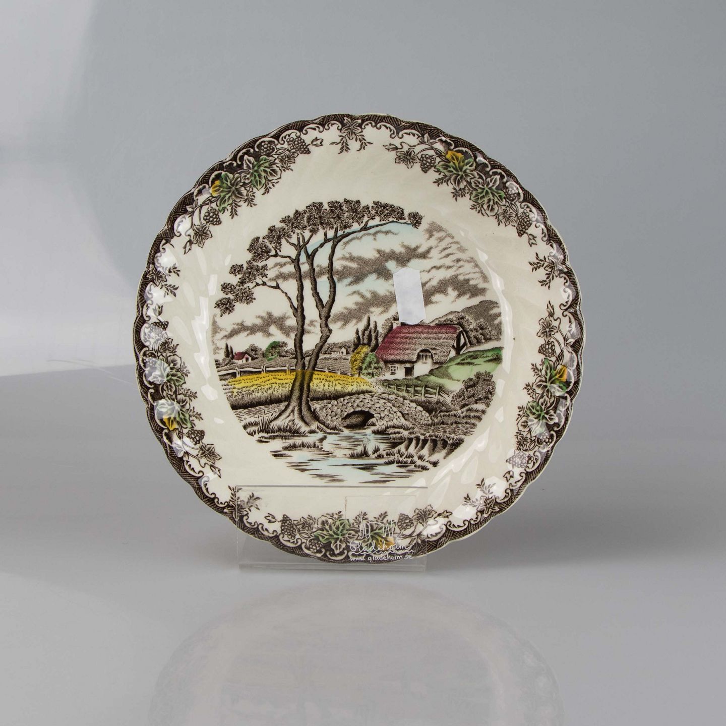 Tallerken i lys fajance med multifarvet landligt motiv.