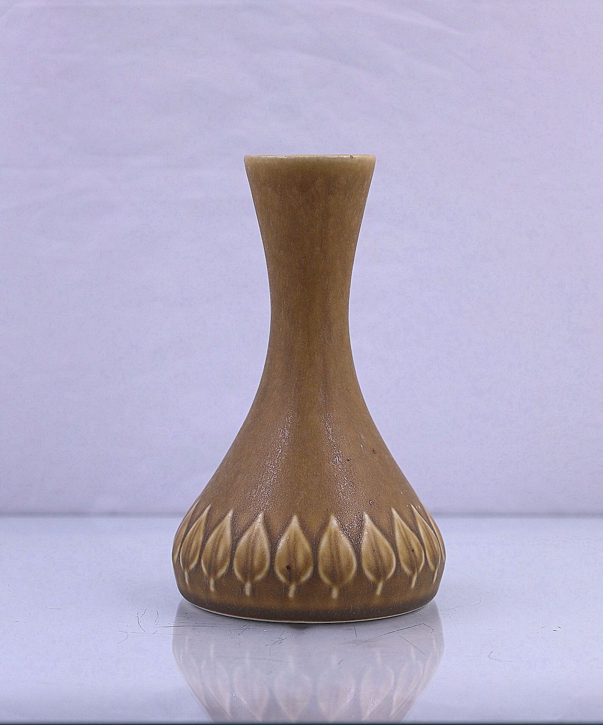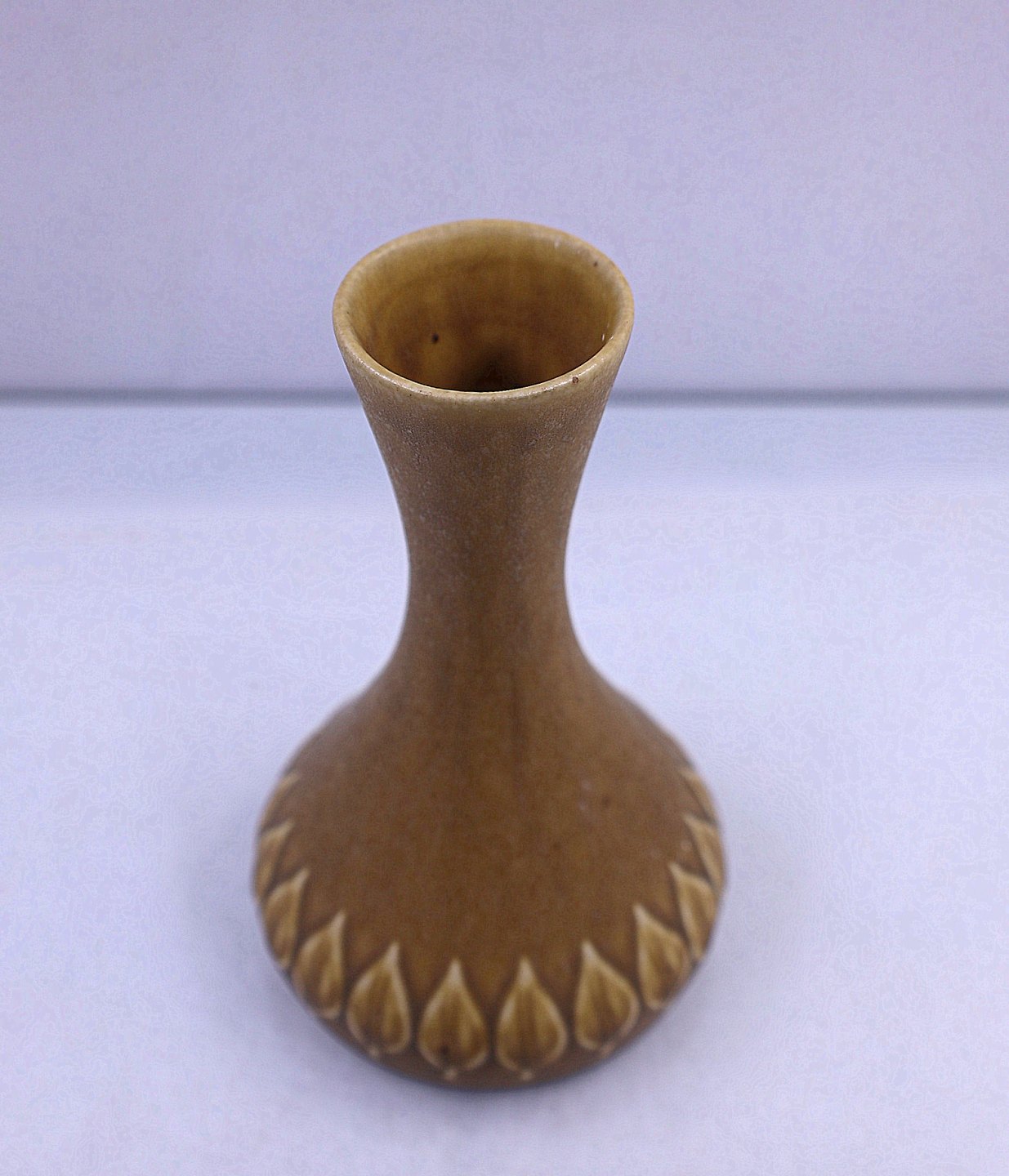 Kronjyden vase af stentøj i Relief, nr. 678. Dekorationen er bladformet mønster i relief, på gulligt stentøj af Jens Harald Quistgaard.