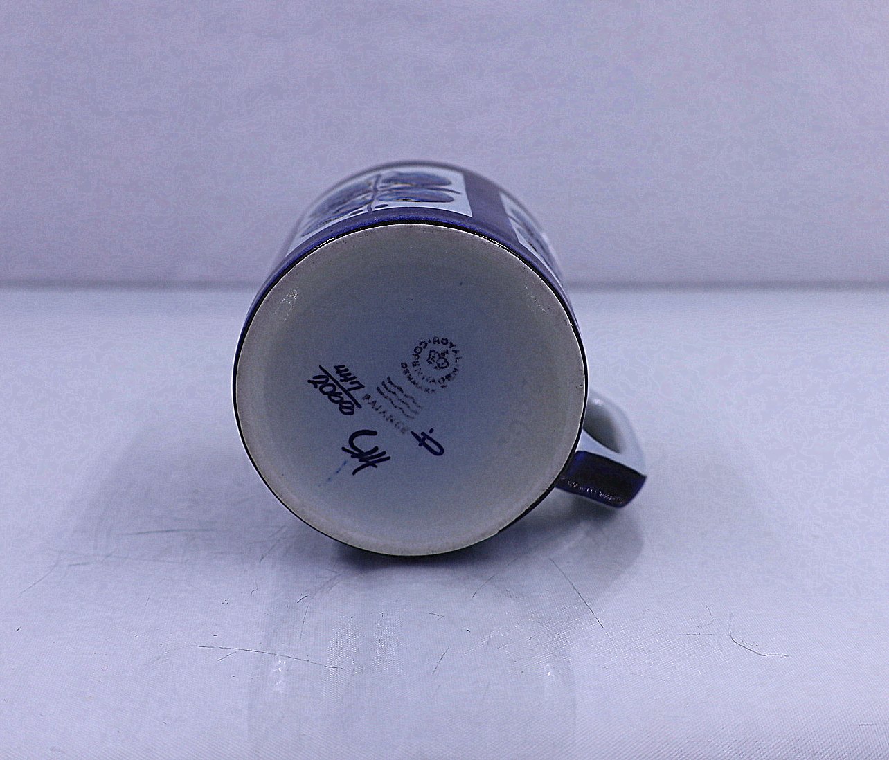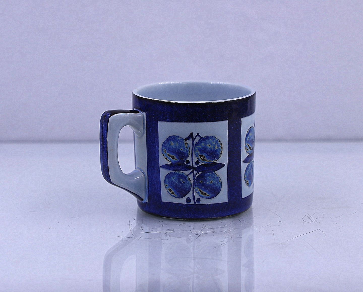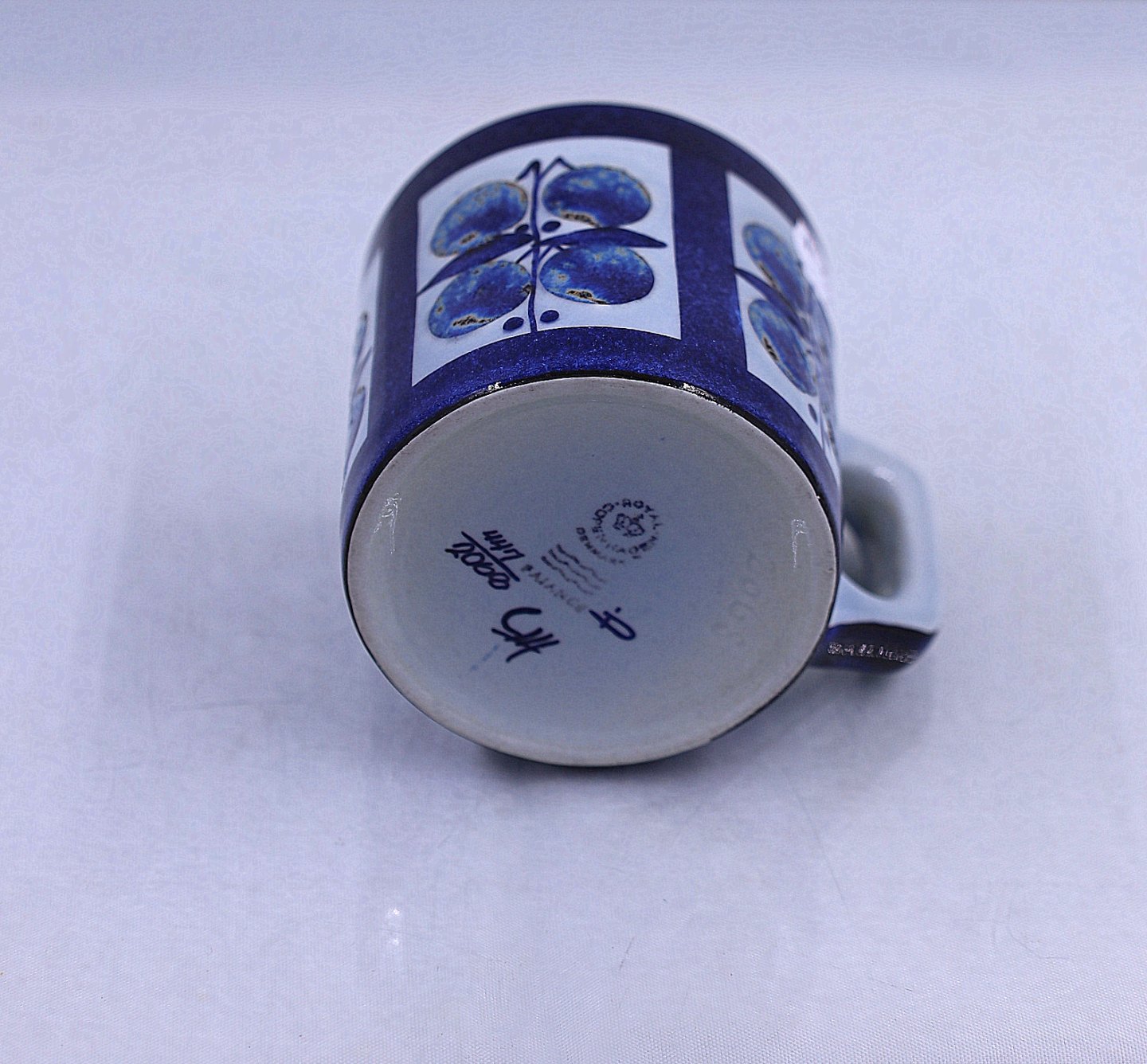 Aluminia, Royal Copenhagen. Krus, special udgave, nr. 447/2068. Dette er et lille krus, dekorationen er 4 blålige æbler, sat i firkant.
