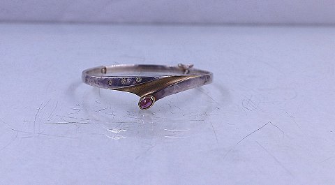 Armring med indlagt guld, 3 klare sten og en lilla sten. Armringen er lukket med sikkerhedslås. 925s sølv. Brugt, men i god stand