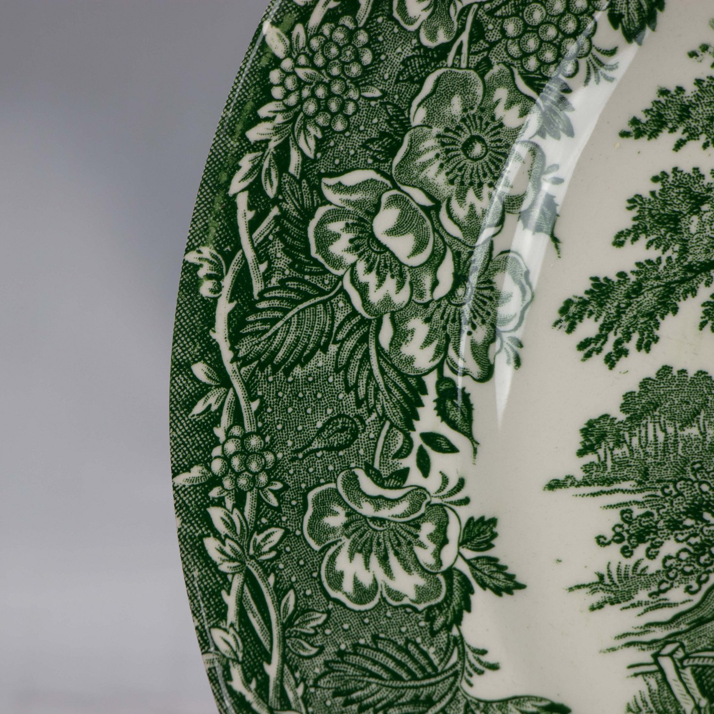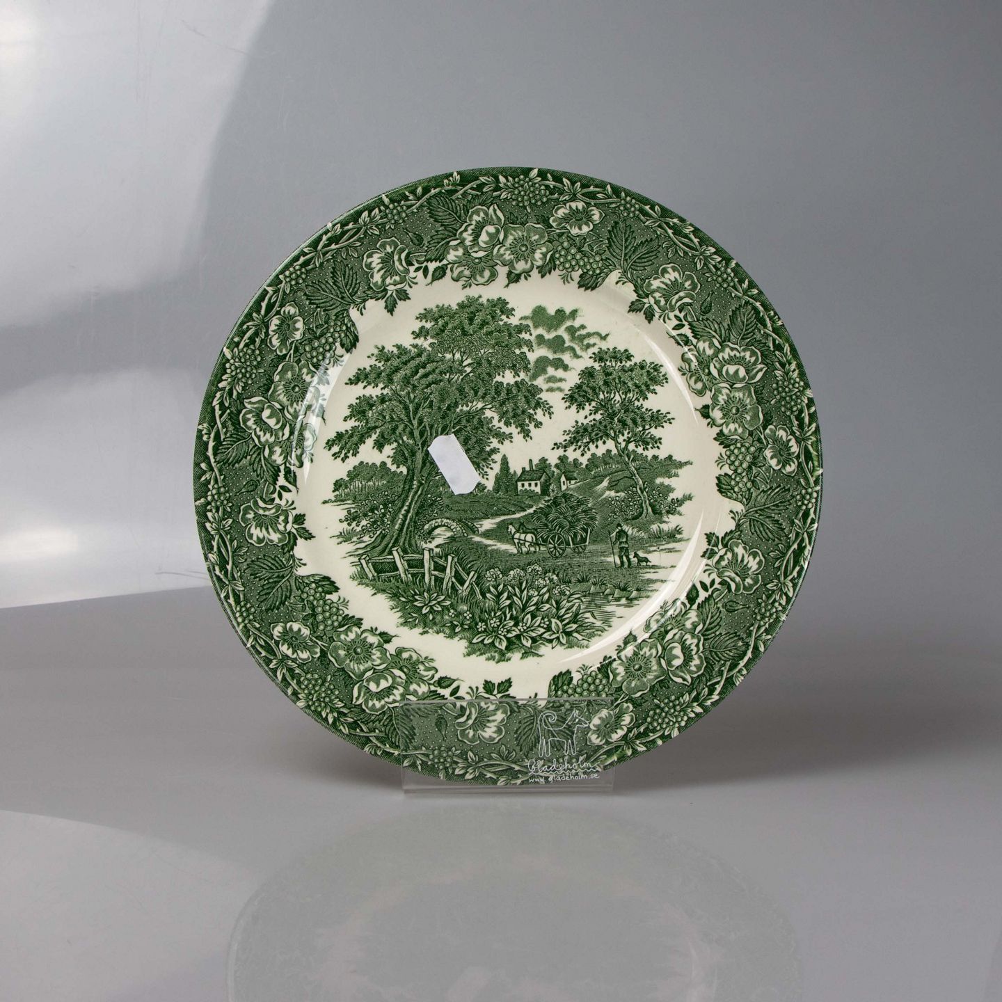 Tallerken i lyst jernporcelæn med landskabsmotiv i grøn nuance