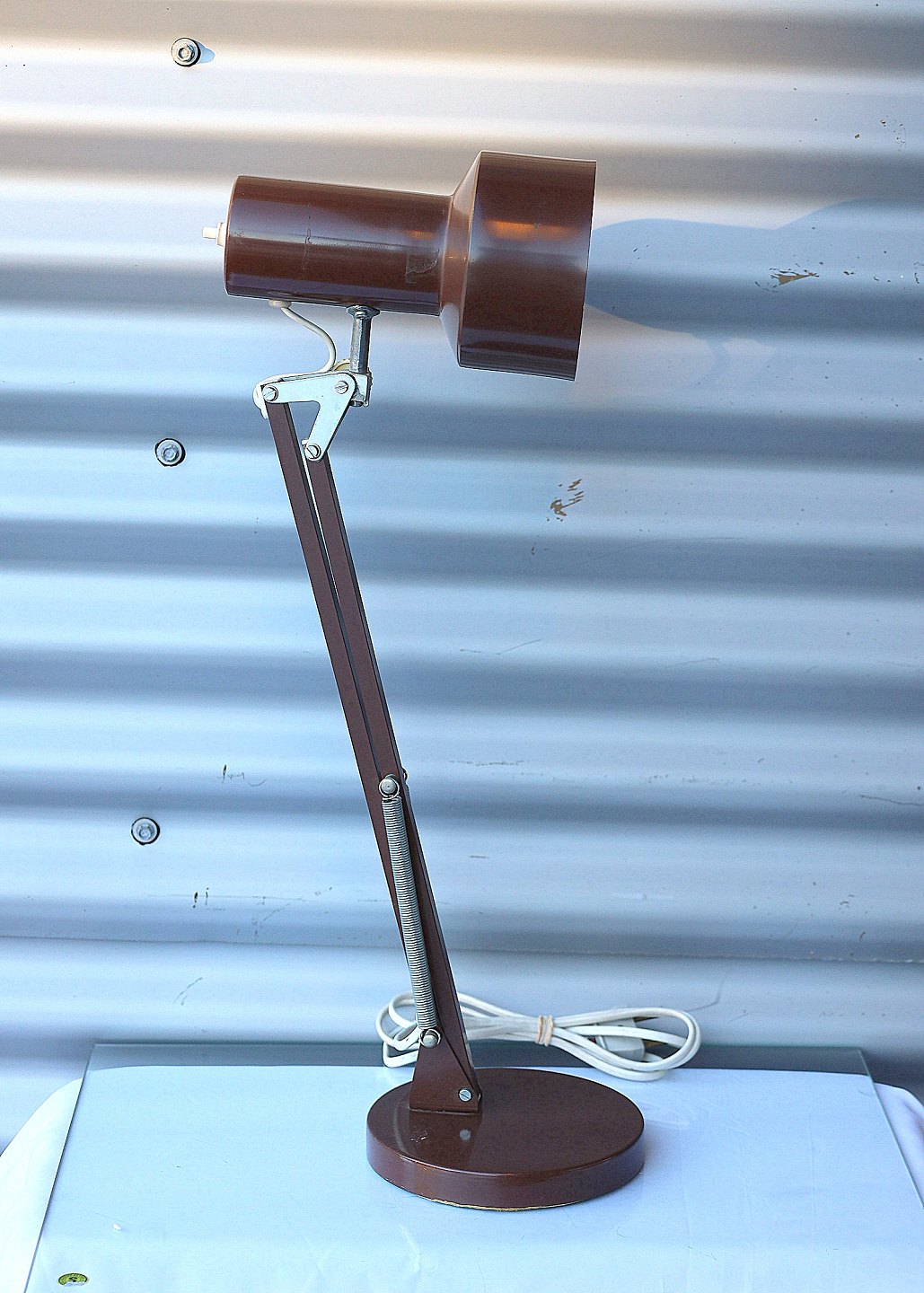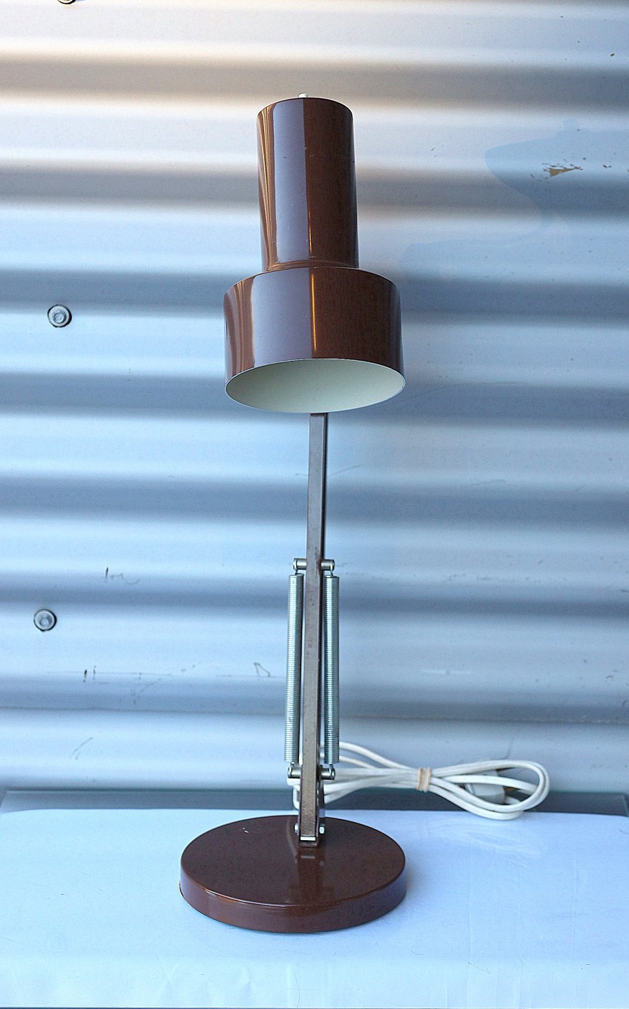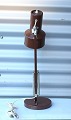 Retro-arkitektlampe. Lampen er brun og har multiindstilling i skærm. Skærm og fod er af brunlakeret metal.