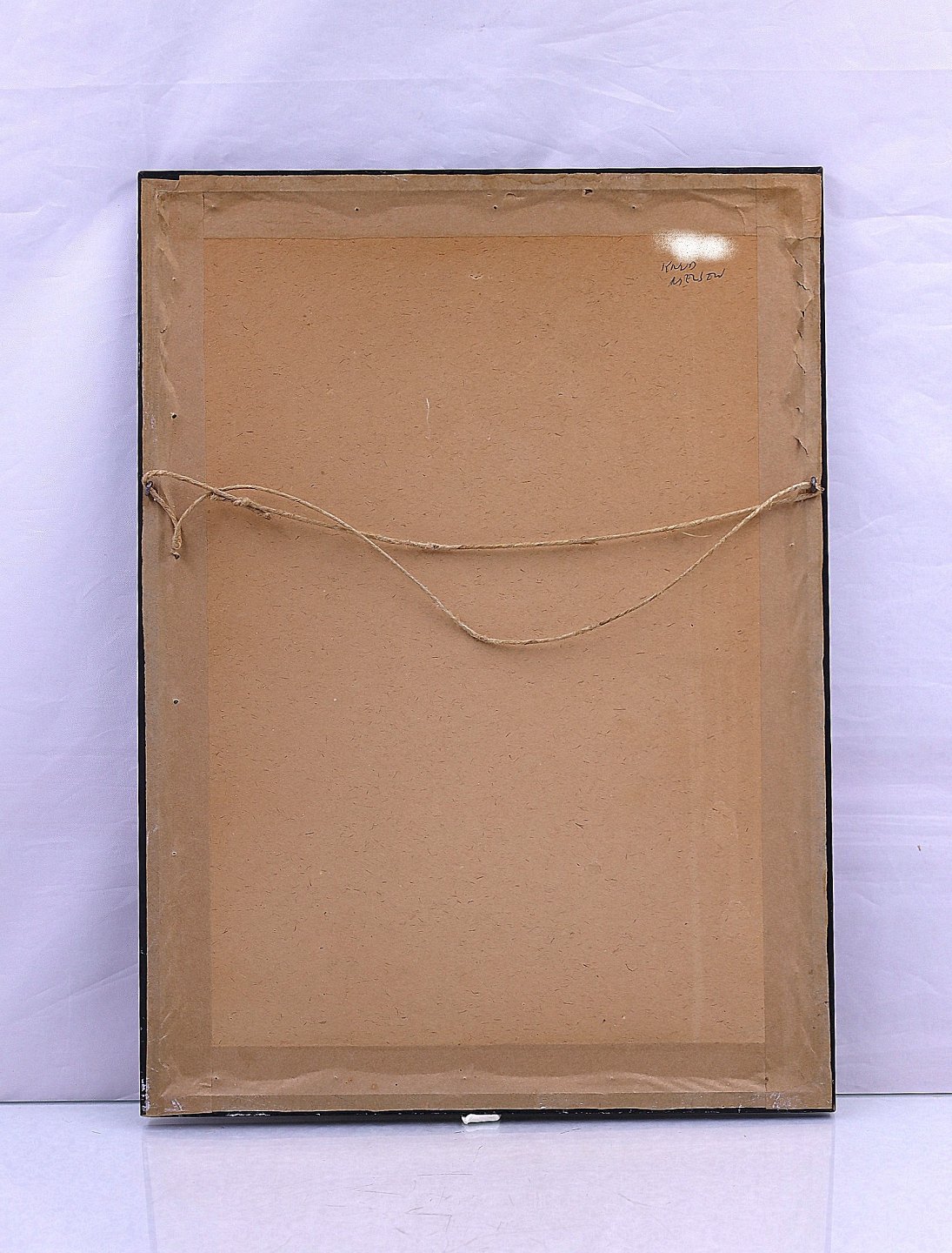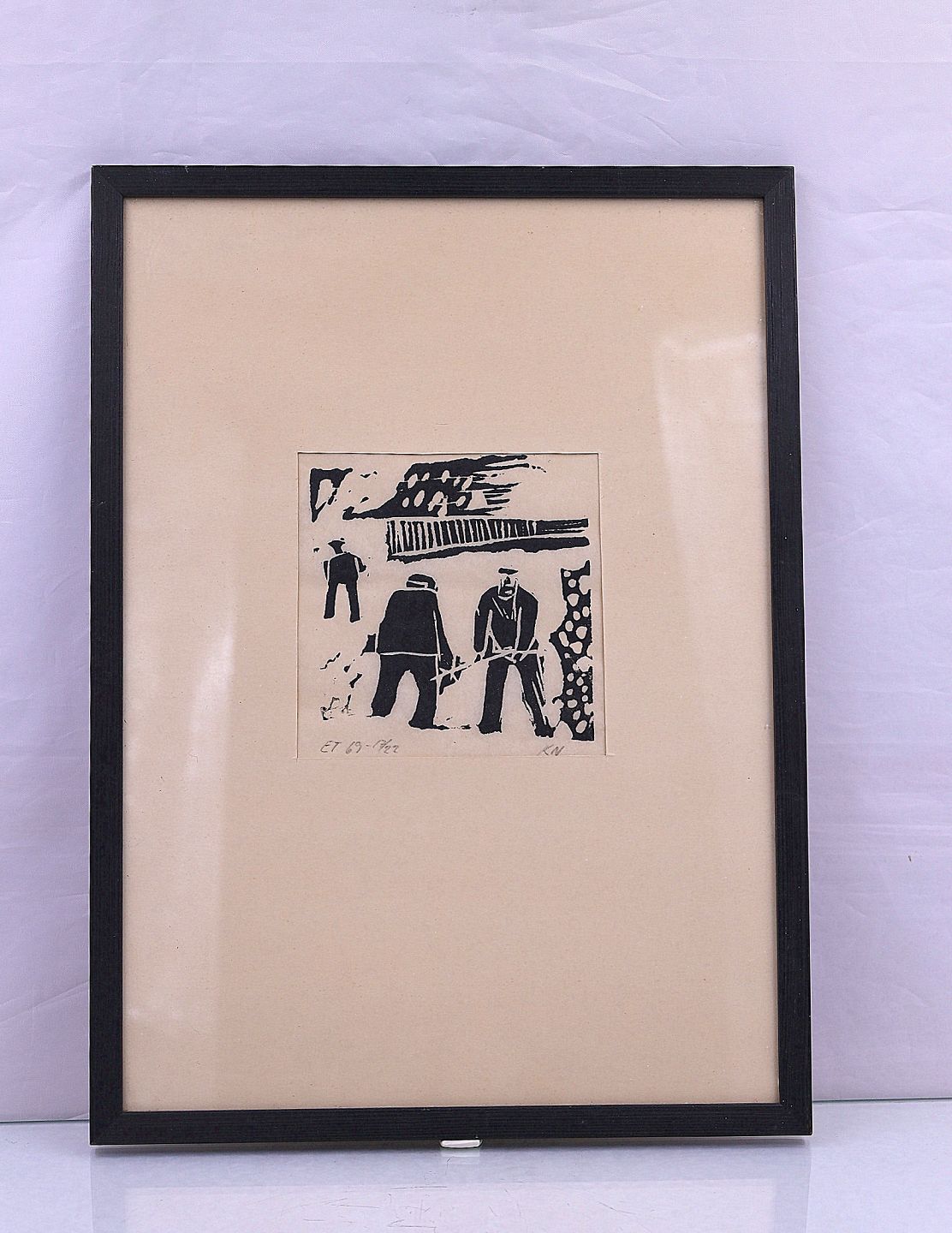 Indrammet Træsnit i træramme med motiv af to mænd, som arbejder mens toget kører forbi nr. 17/22.