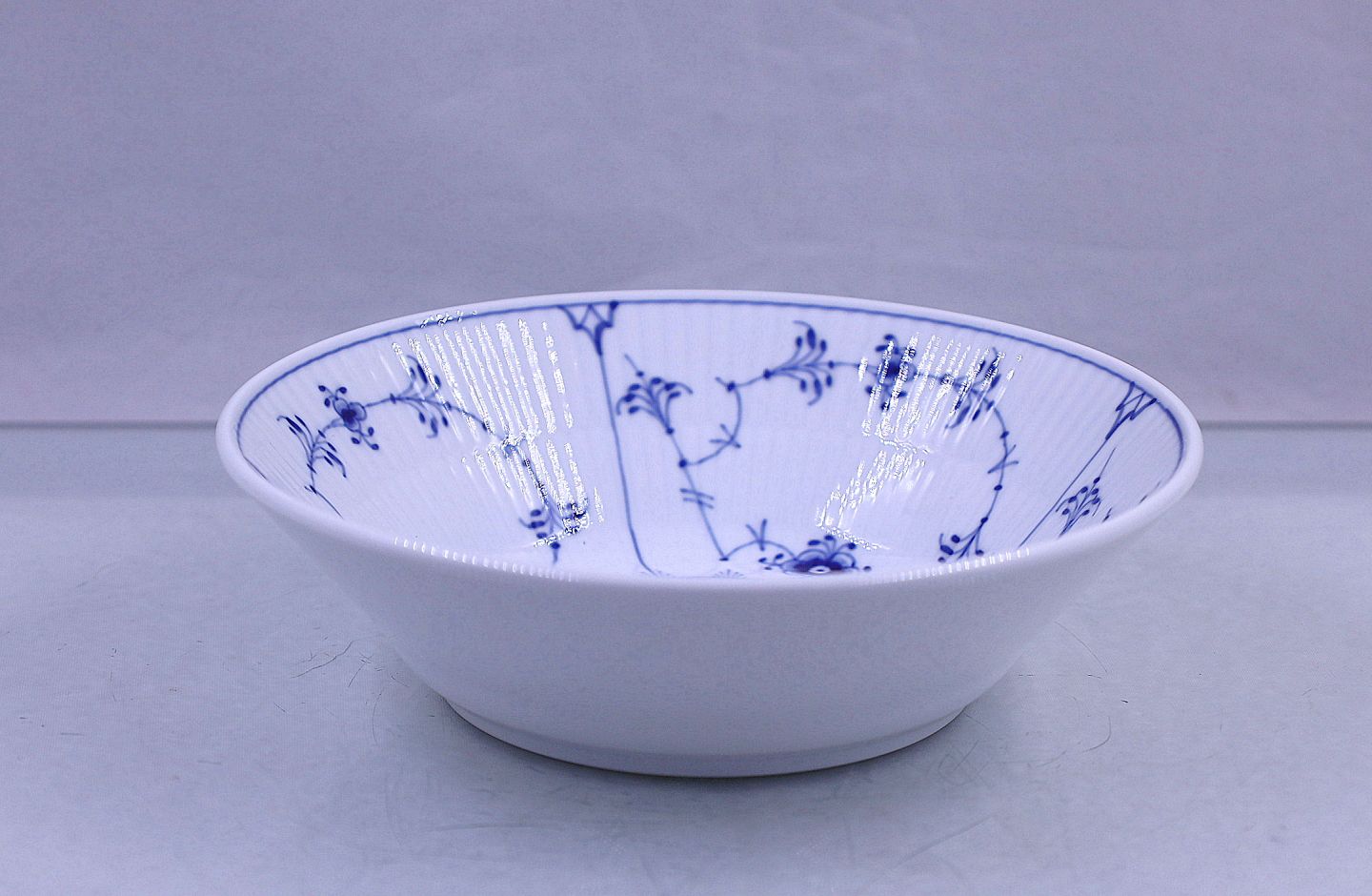 Royal Copenhagen. Musselmalet, riflet dyb tallerken eller ymerskål nr. 600. Tallerkenen er i de klassiske hvide og blå farver, håndmalet porcelæn