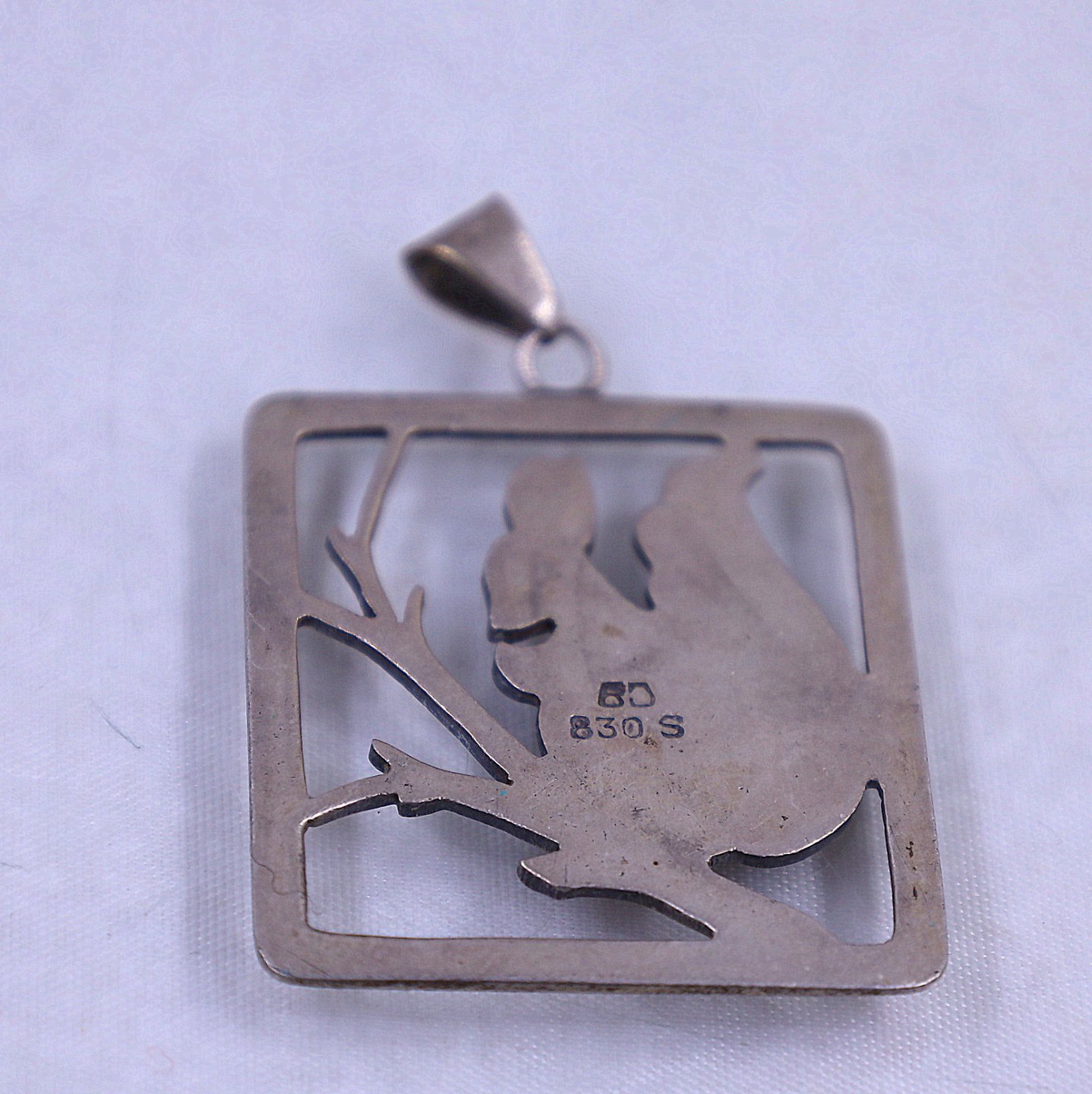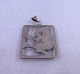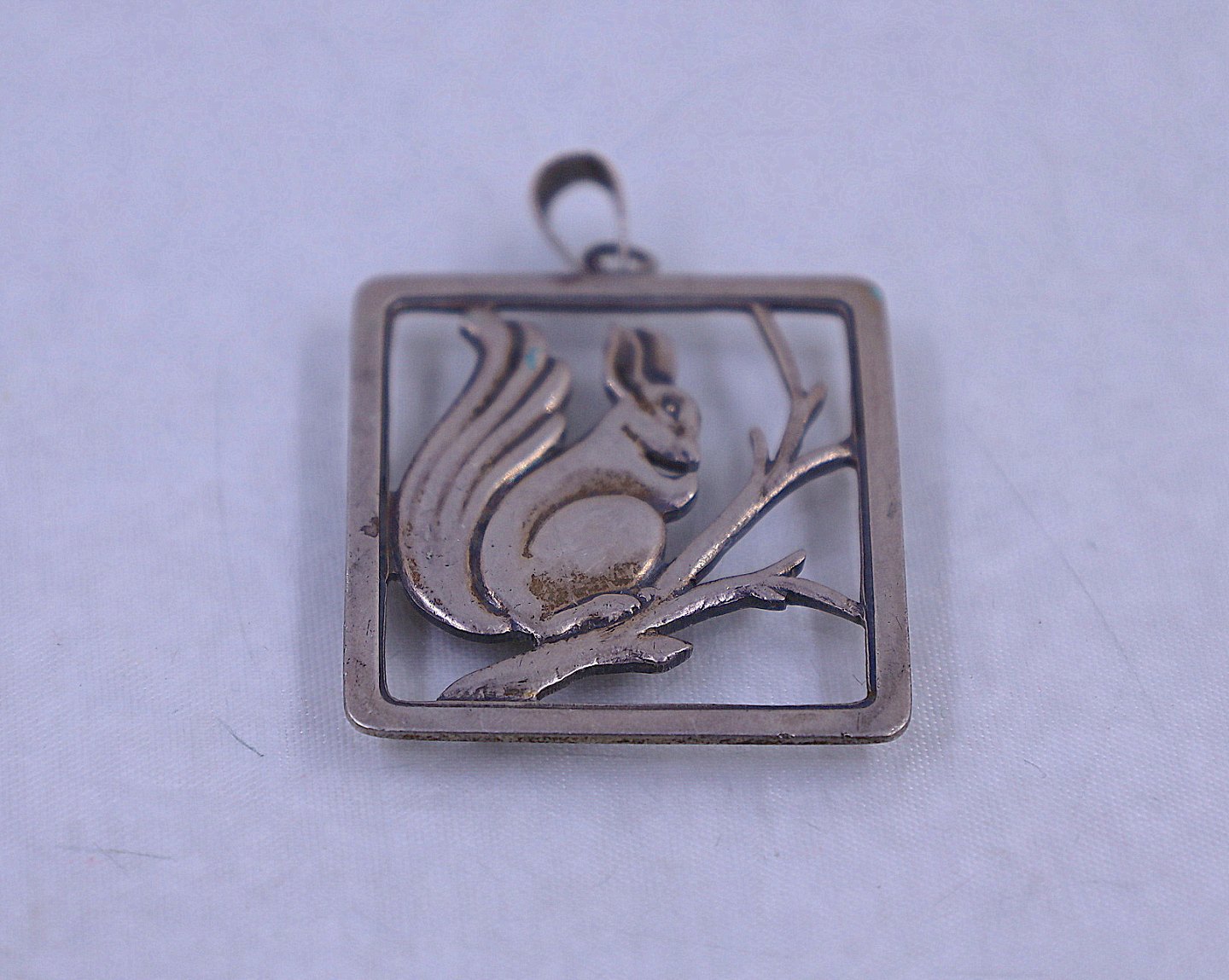 Ib Jensen. Firkantet sølv vedhæng, med egern der sidder på en gren. Vedhænget er stemplet "IB J 830S"