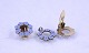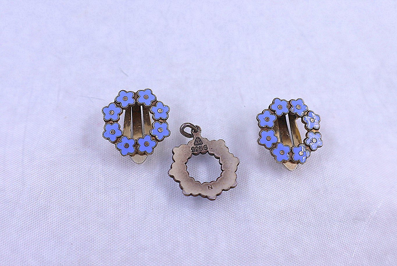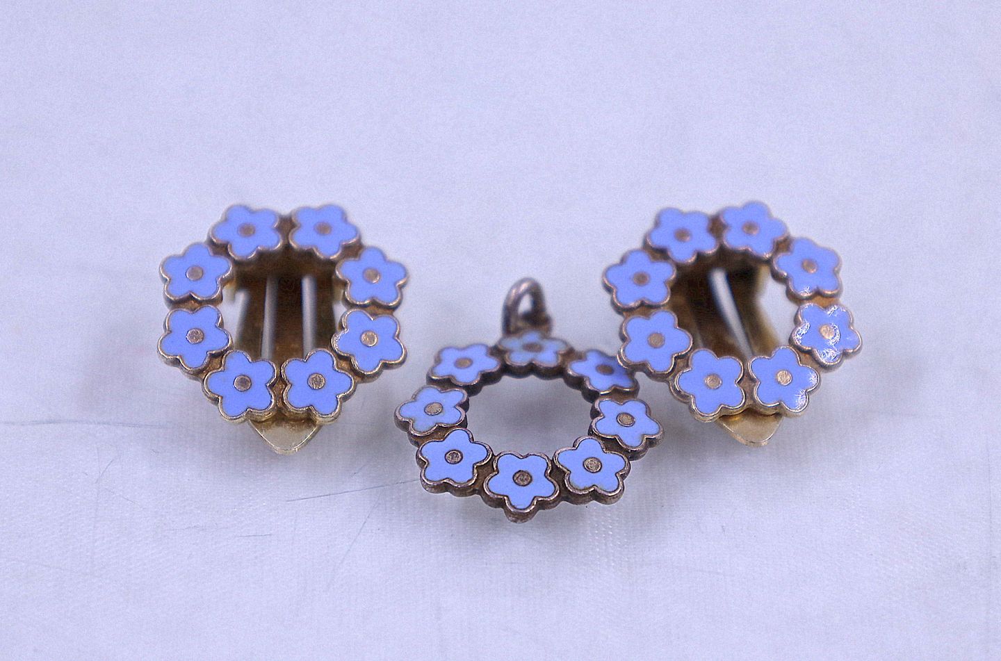 Antn Michelsen. Forglem-mig-ej smykkesæt i forgyldt sterling sølv og blåt emalje. sættet består af øreclips og vedhæng.