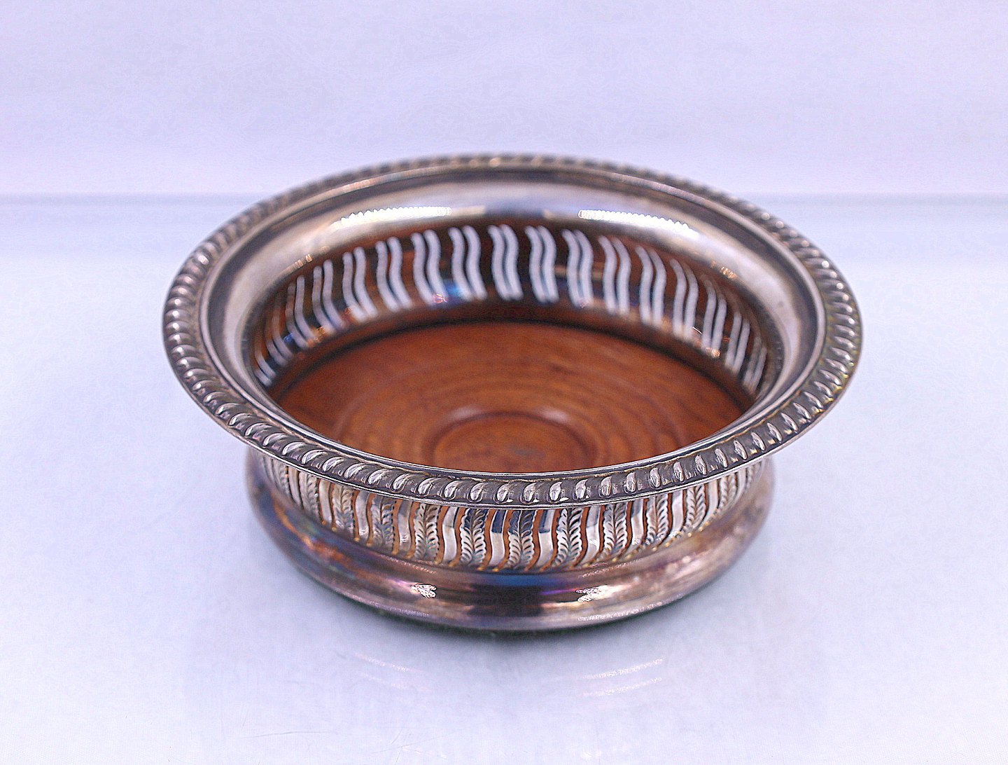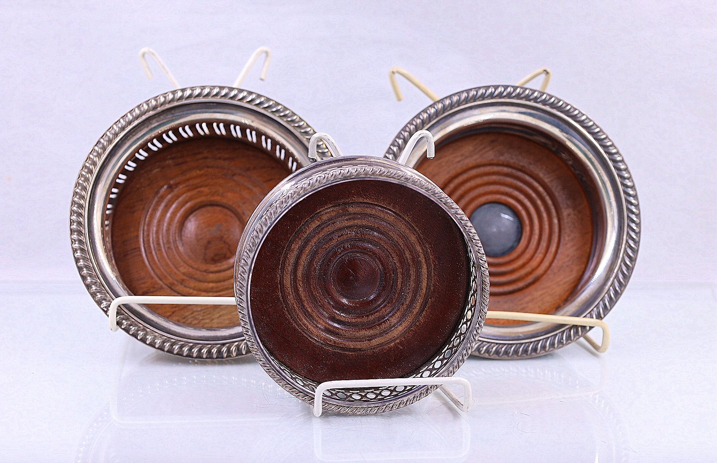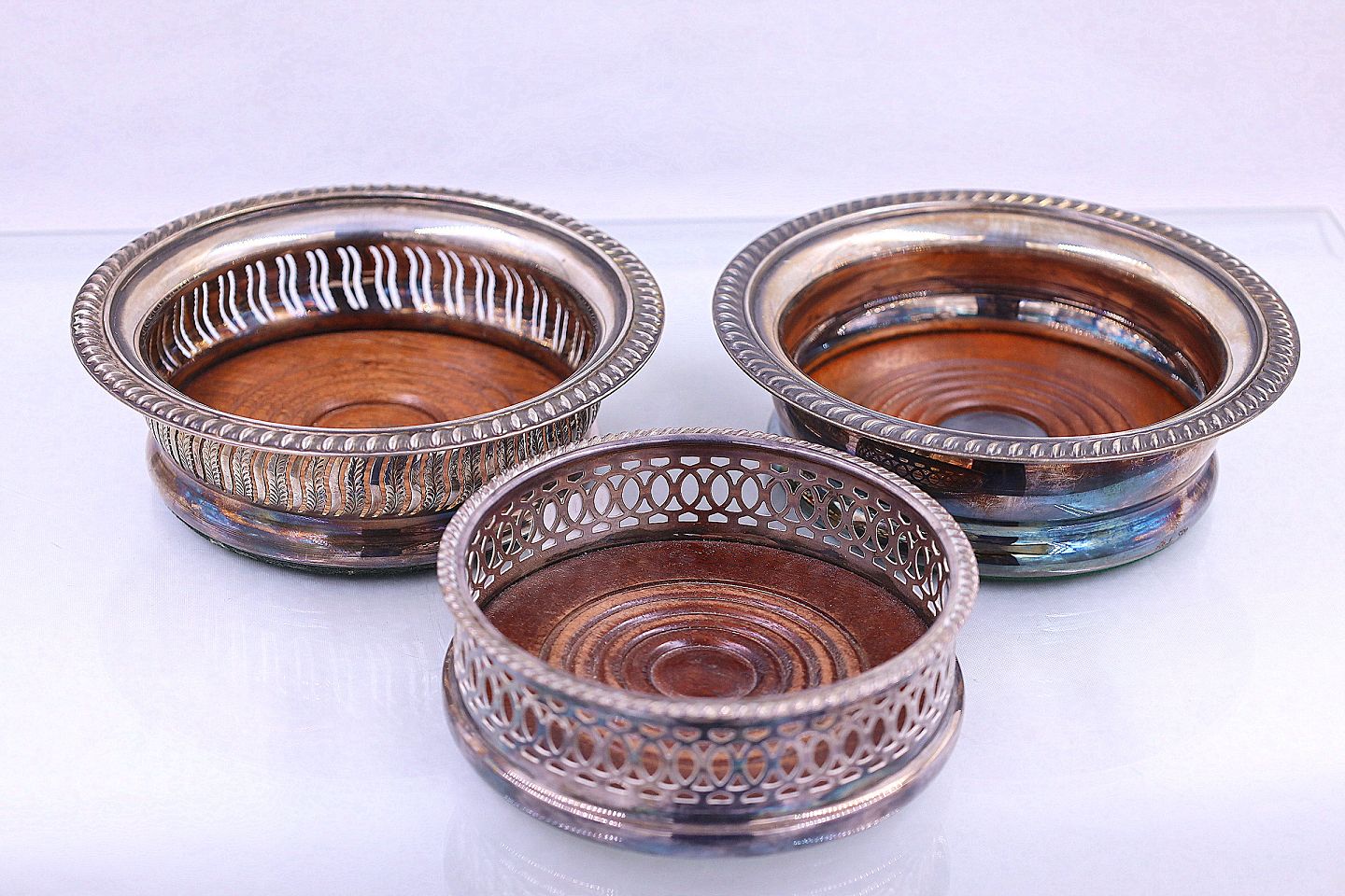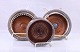 3 stk. engelske vinbakker, i sølvplet og med mahogni bund. 2 er solgt en tilbage, den med mørk midt pris 350