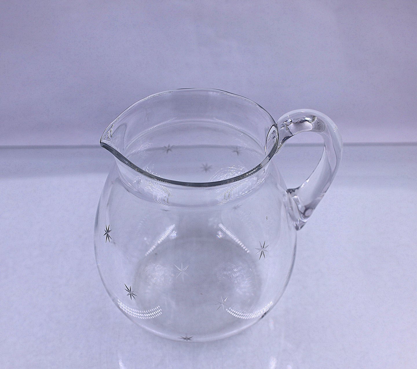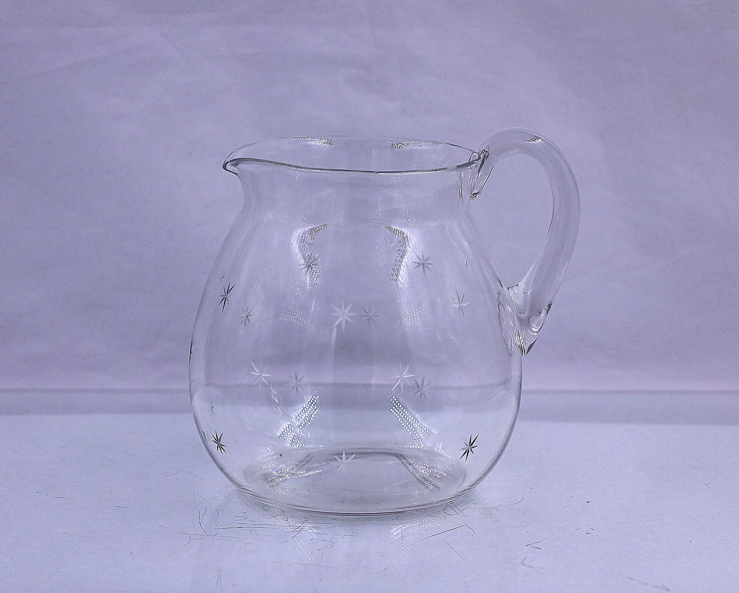 Holmegaard Glasværk stjerne kande. Buttet glaskande med slebne stjerner og påsat hank.