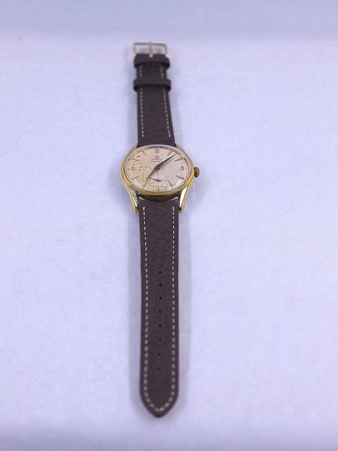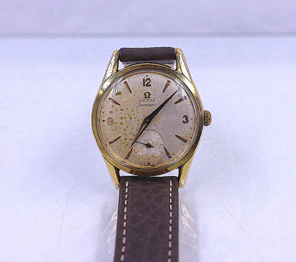 Omega Seamaster. Herreur, 18 karat guld. Swiss made. Uret er fra ca. 1950´erne og er med håndoptræk. Uret er waterproof. Uret kommer med ny Buffalo urrem. Urskiven er lidt patenteret, men uret er i god stand.
