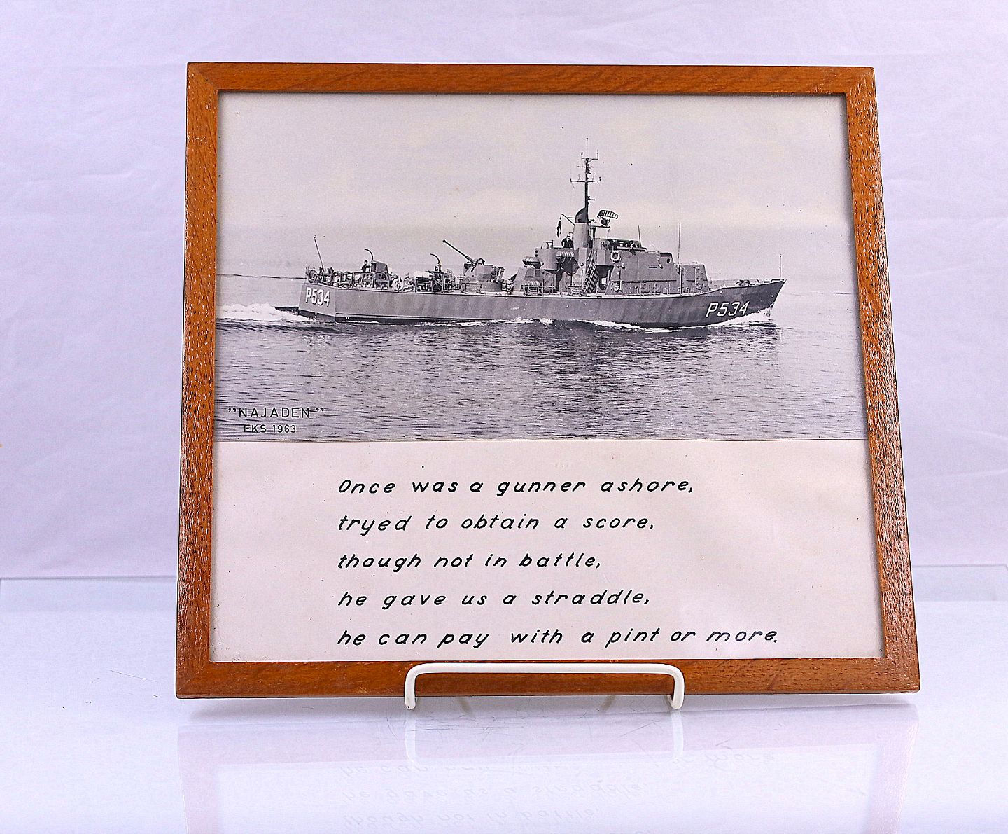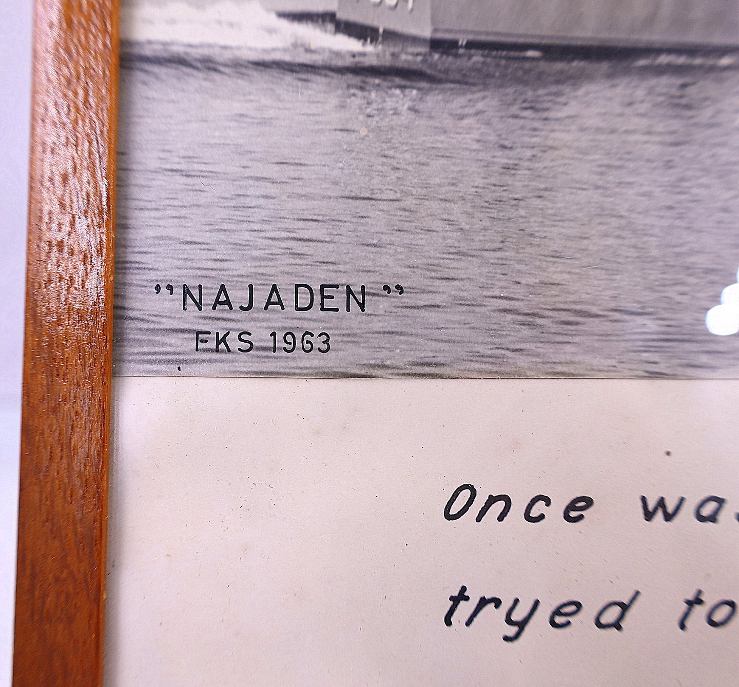 Sort/hvid fotografi af "Najaden". Der er et lille episk digt under fotoet, på fotoet står "Najaden" FKS 1963. "Najaden" var et bevogtningsfartøj, fartøjet var oprindelig malet olivengrøn, men blev senere malet standartgrå. Billedet er indrammet i træramme og der er ingen brugsspor