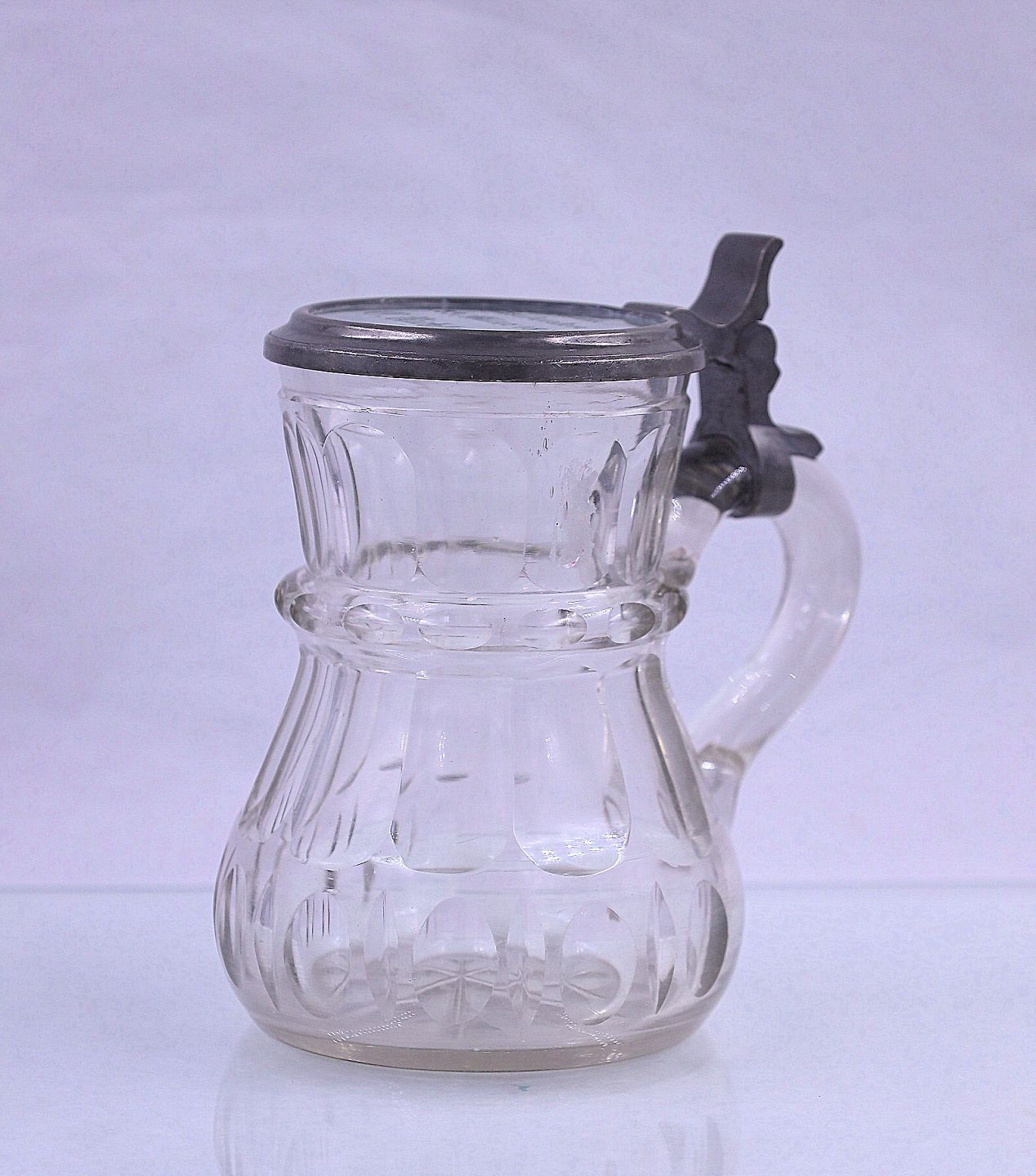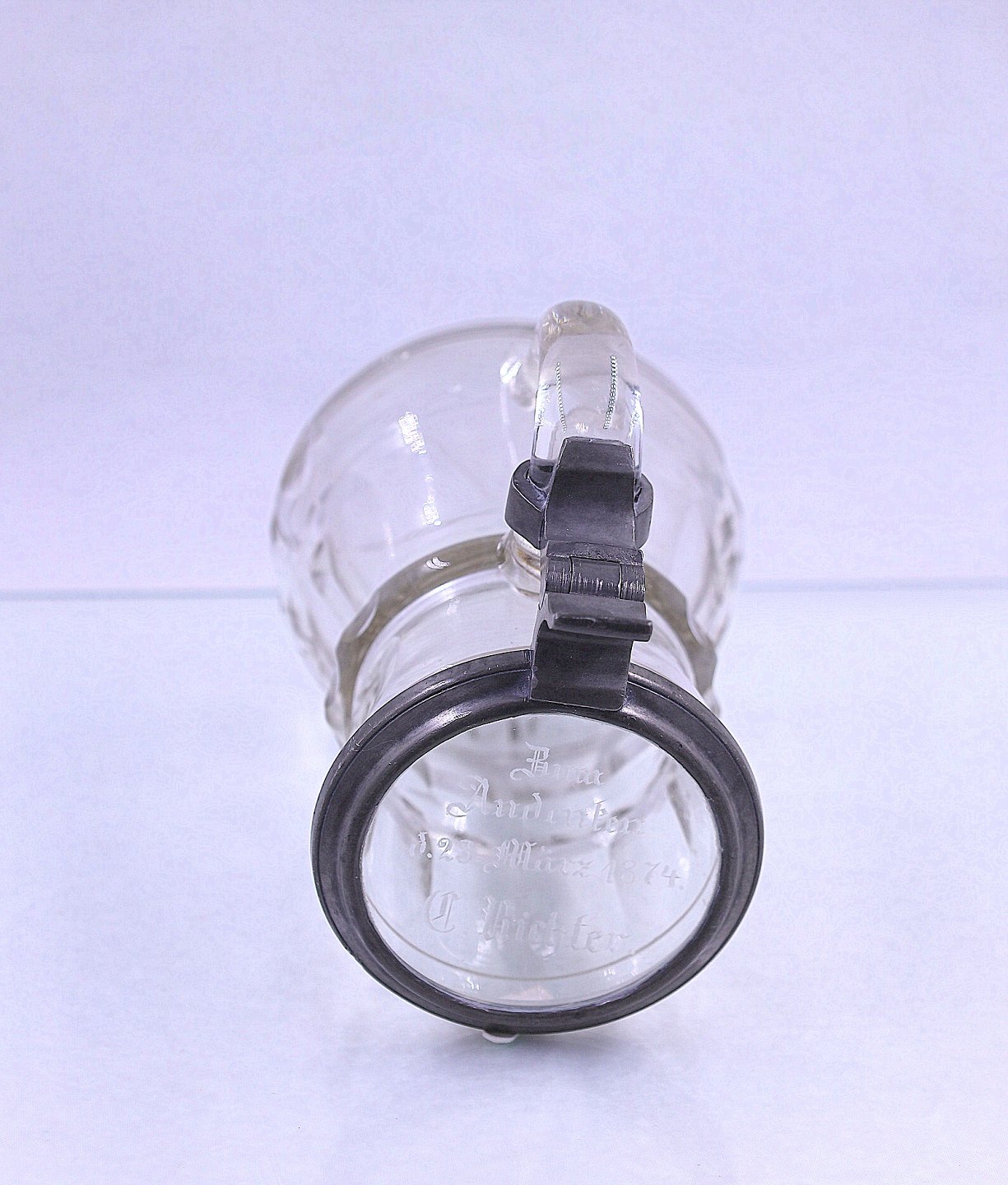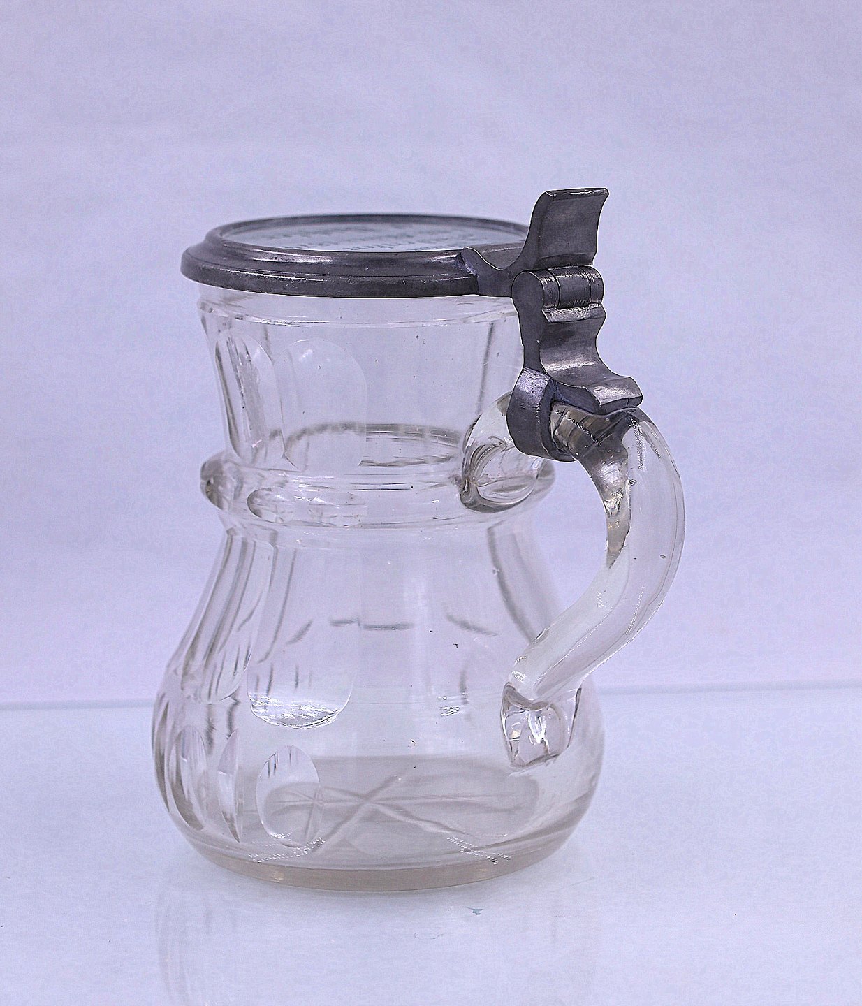 Glas med tinkanter og vippelåg. På låget er der, med gotisk skrift, graveret navn og dato, Anna Andersen, 23 märtz, 1874.