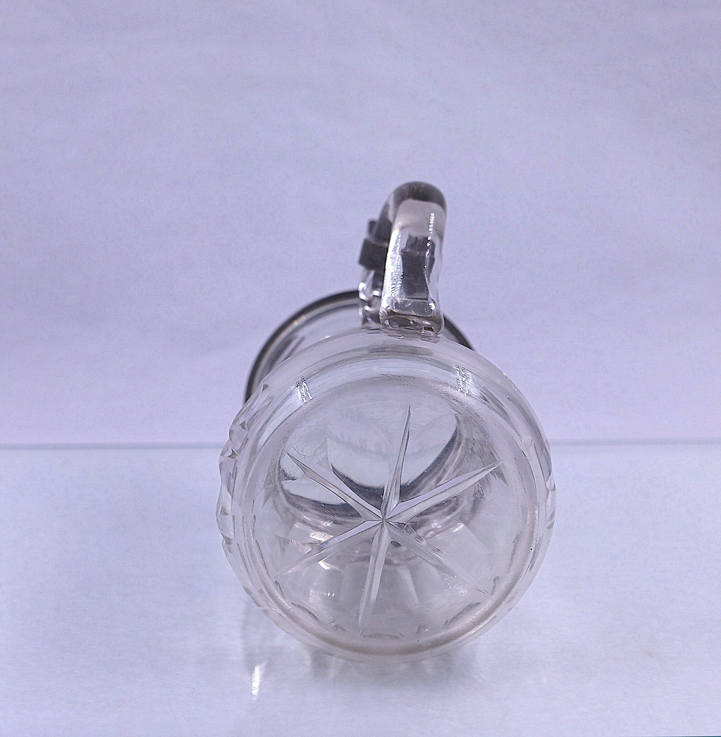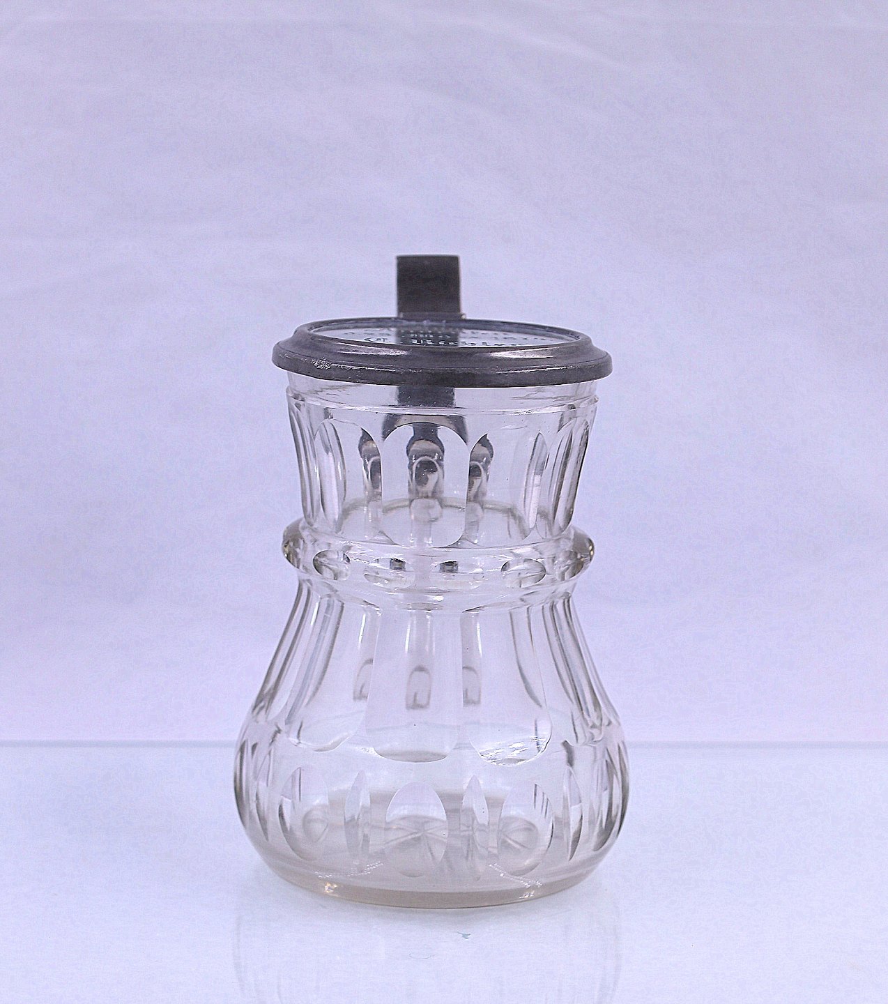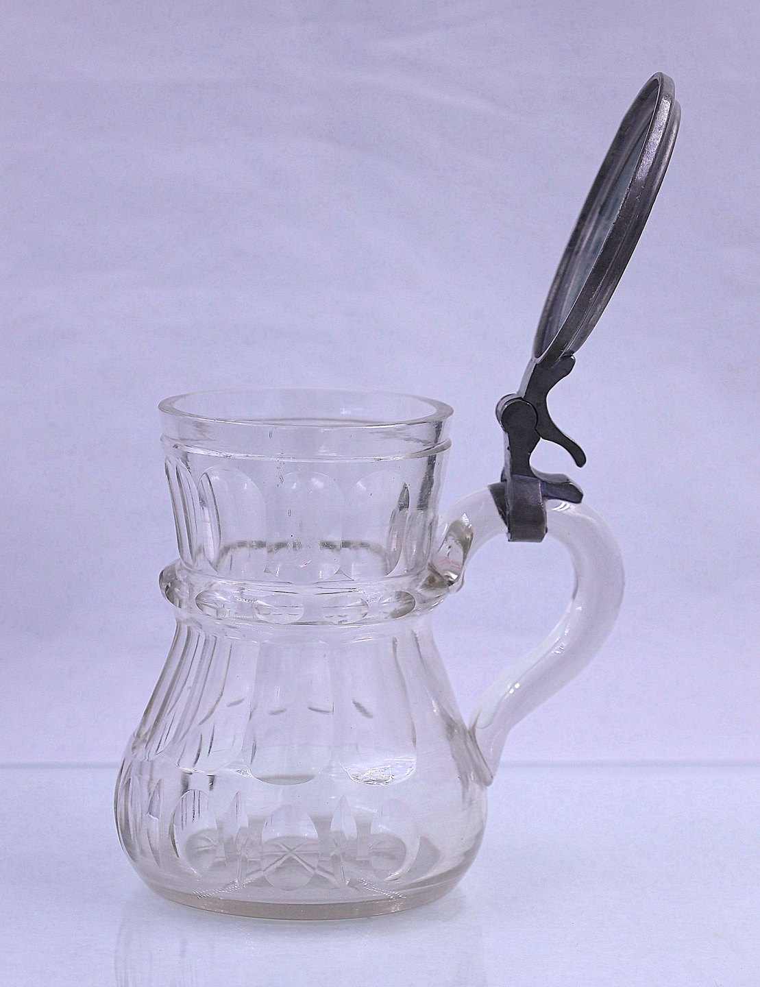 Glas med tinkanter og vippelåg. På låget er der, med gotisk skrift, graveret navn og dato, Anna Andersen, 23 märtz, 1874.