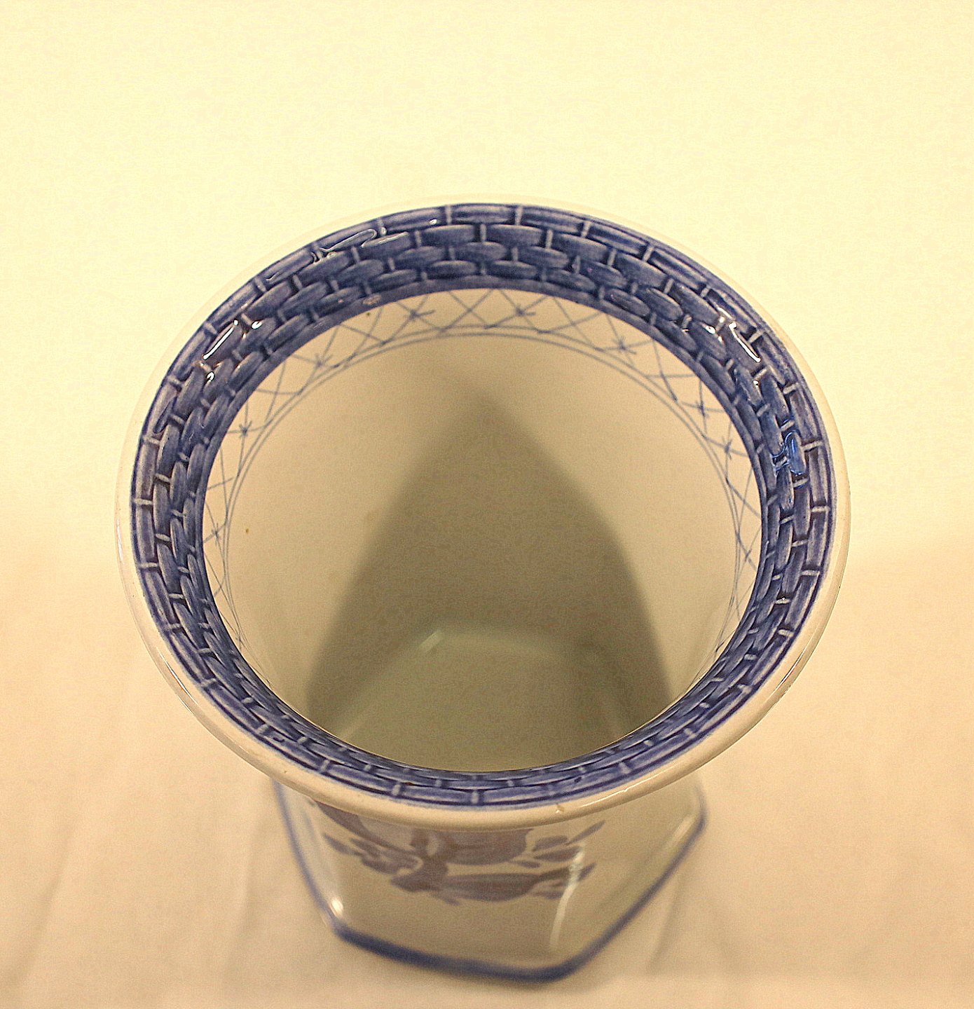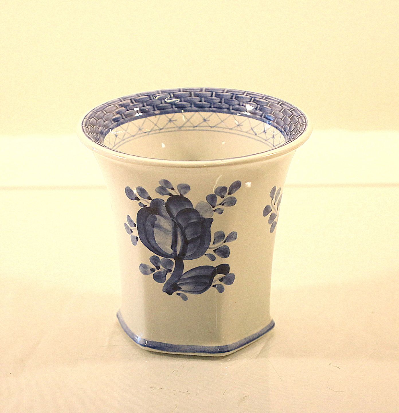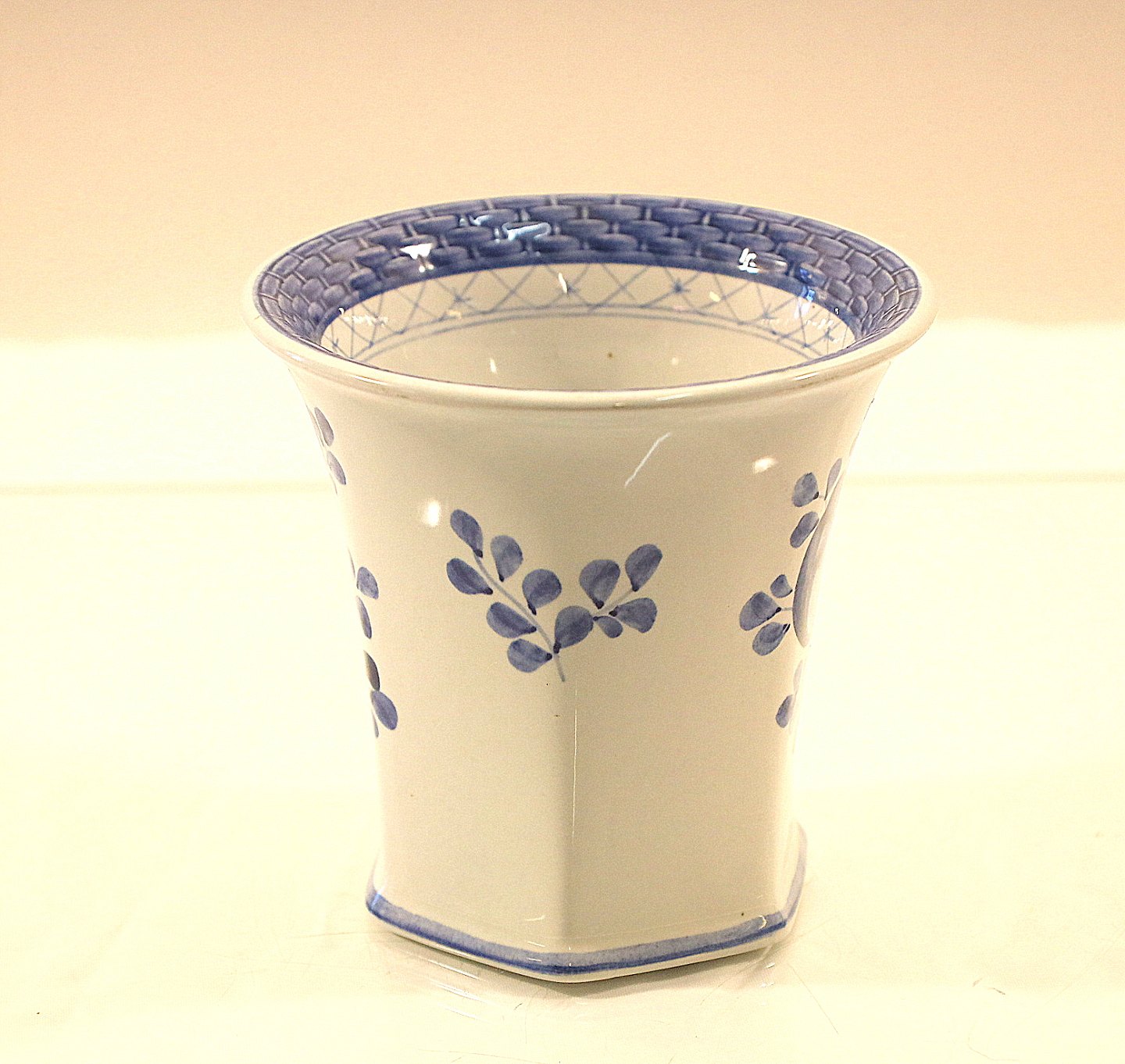 Glat hvid fajance med blå dekoration af blomster og blå bort