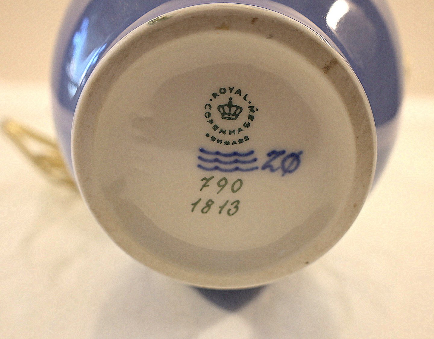 Lampefoden i hvid porcelæn med gradueret blåtonet bund dekoreret med blå pragtsnerle og grønne blade.