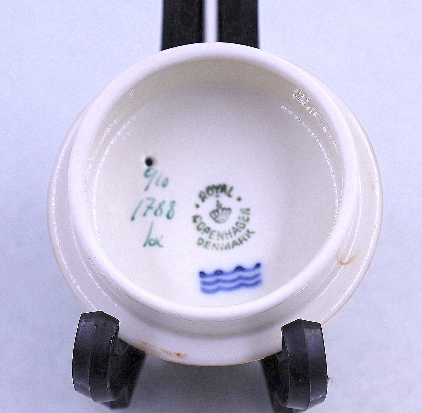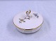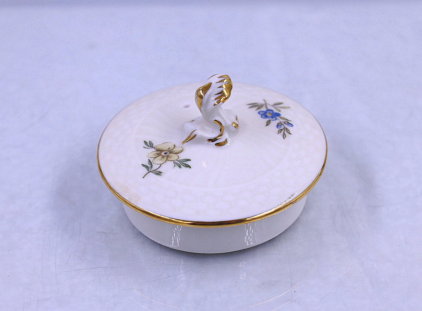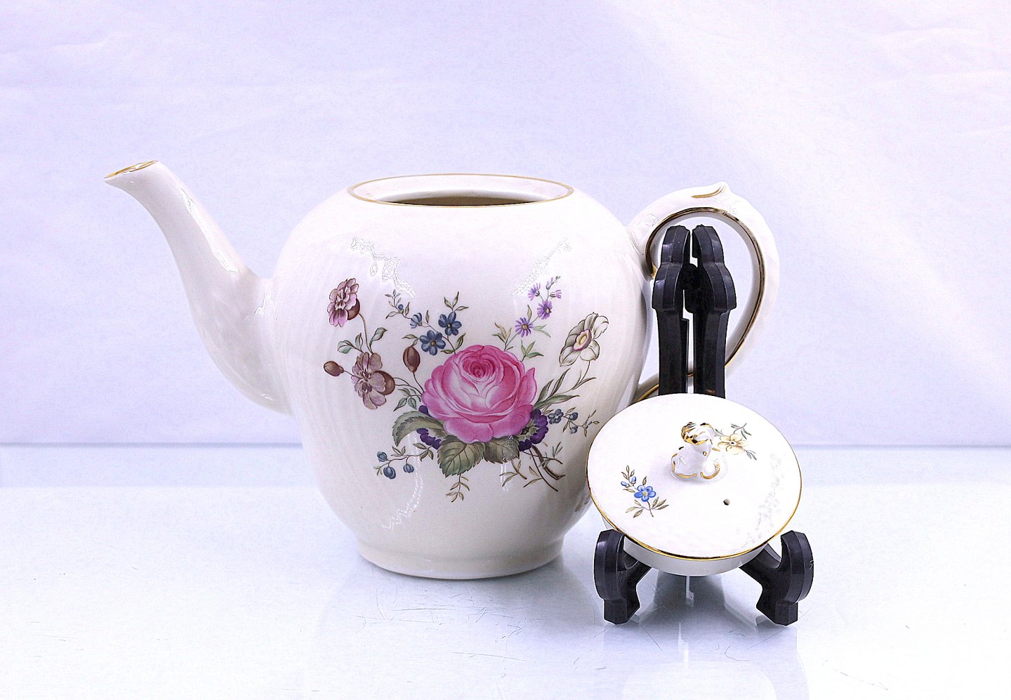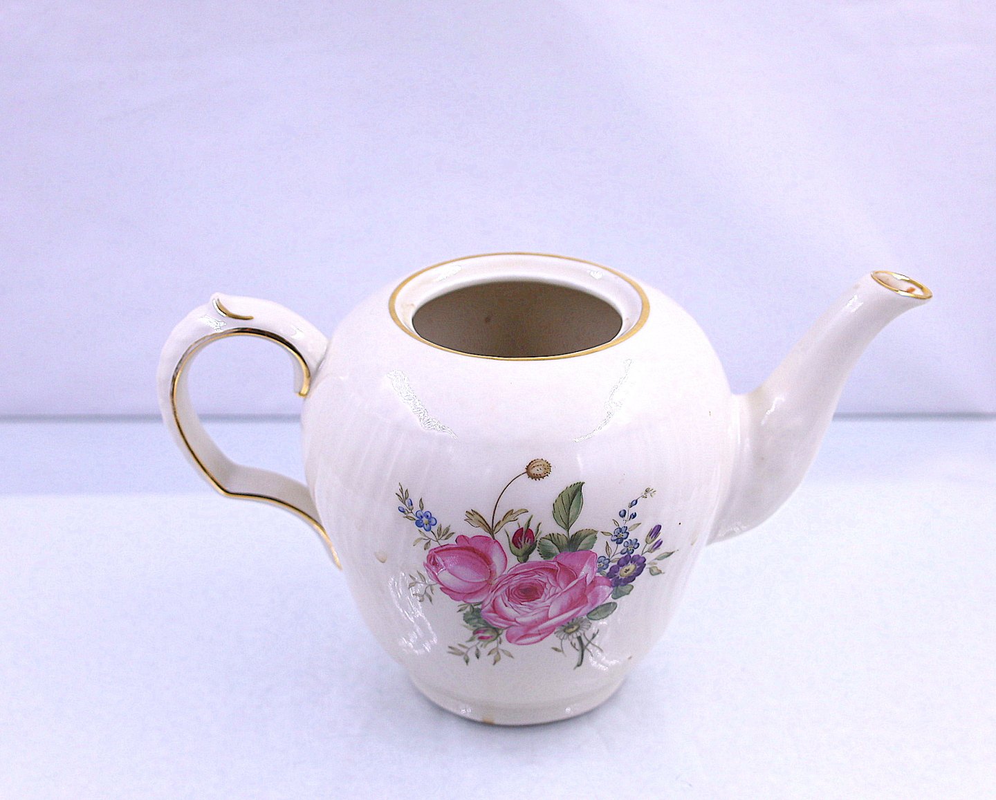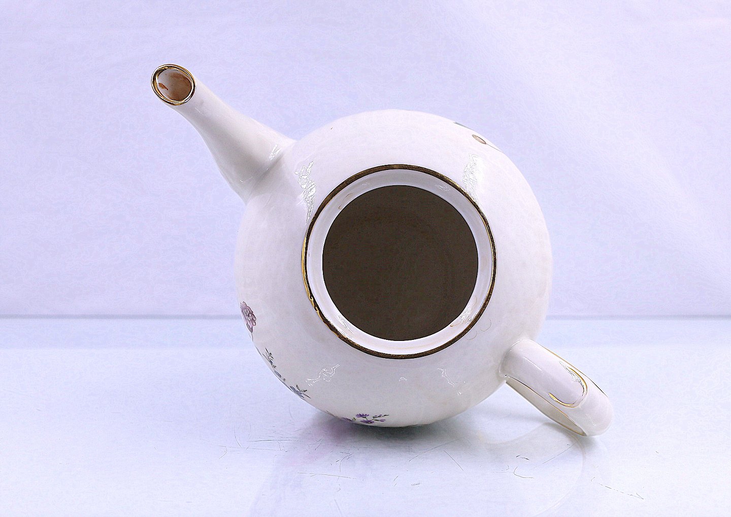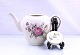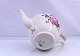 Kanden indeholder 1 liter og er i hvidt porcelæn med blomstermotiv på svejfet stel med guldkant.