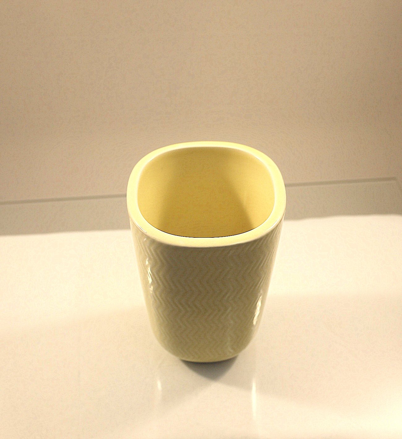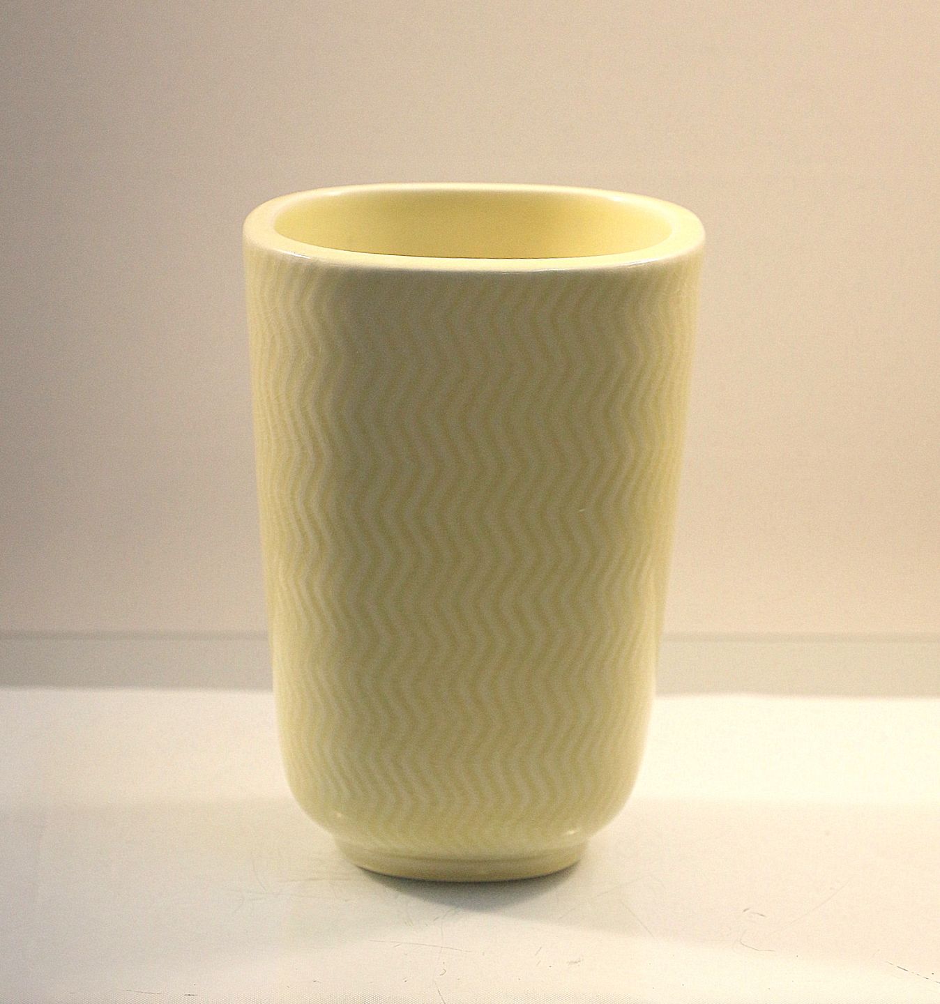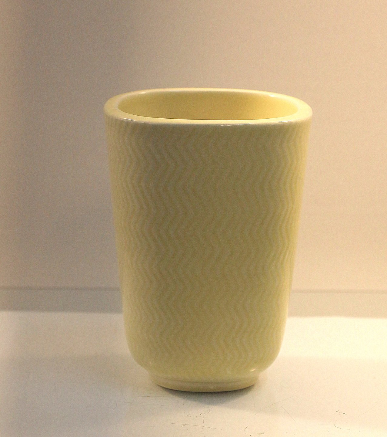 Aluminia Marselis vase nr. 2645. 4-kantet vase, vasen er gul med bølge mønster.
