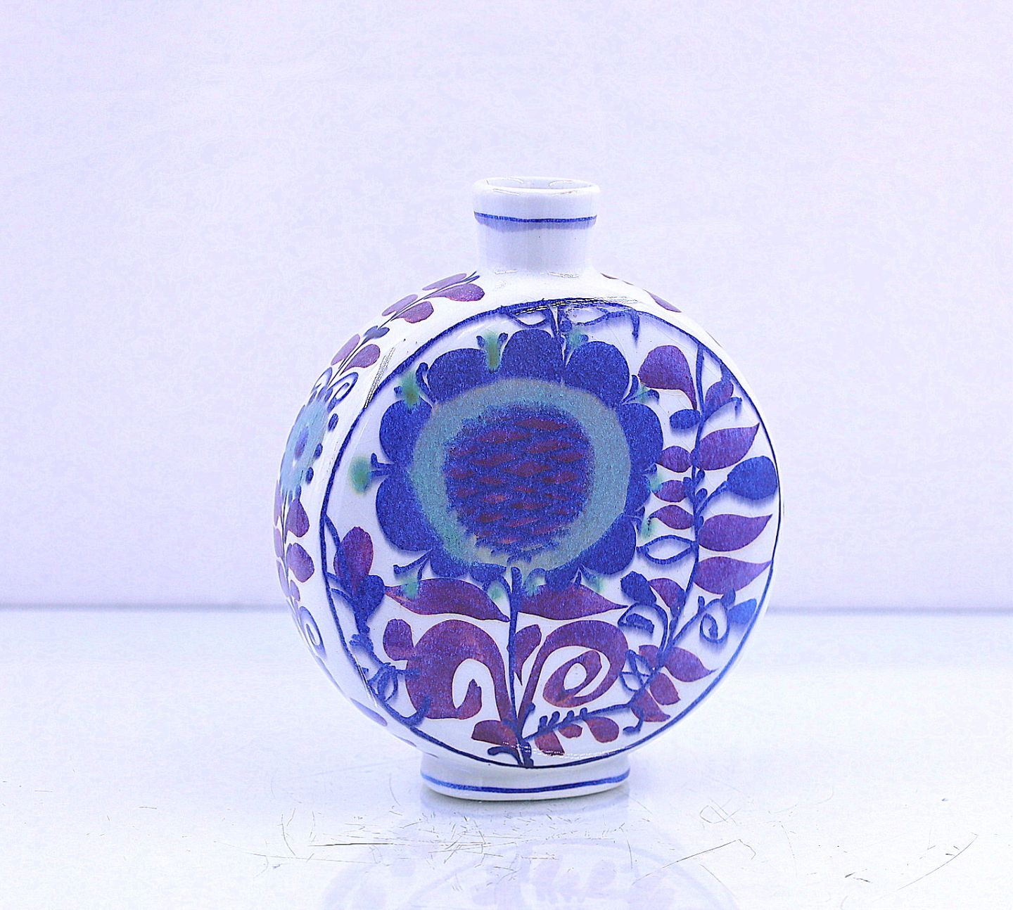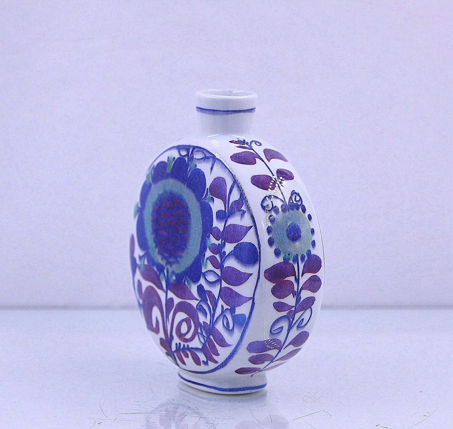 Royal Copenhagen Fajance vase. Tenera rund vase, nr. 211/3102. Vasen er dekoreret med et blå/lilla mønster.