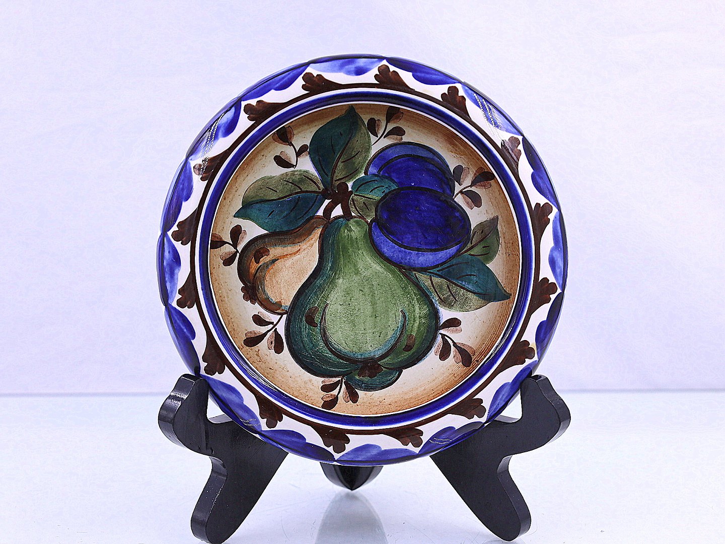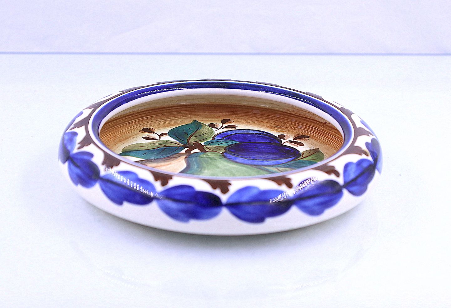 Skålen er dekoreret med stiliseret frugter, pærer og blommer. Kanterne er bøjet indad, og dekoreret med blå og brune bølger.
