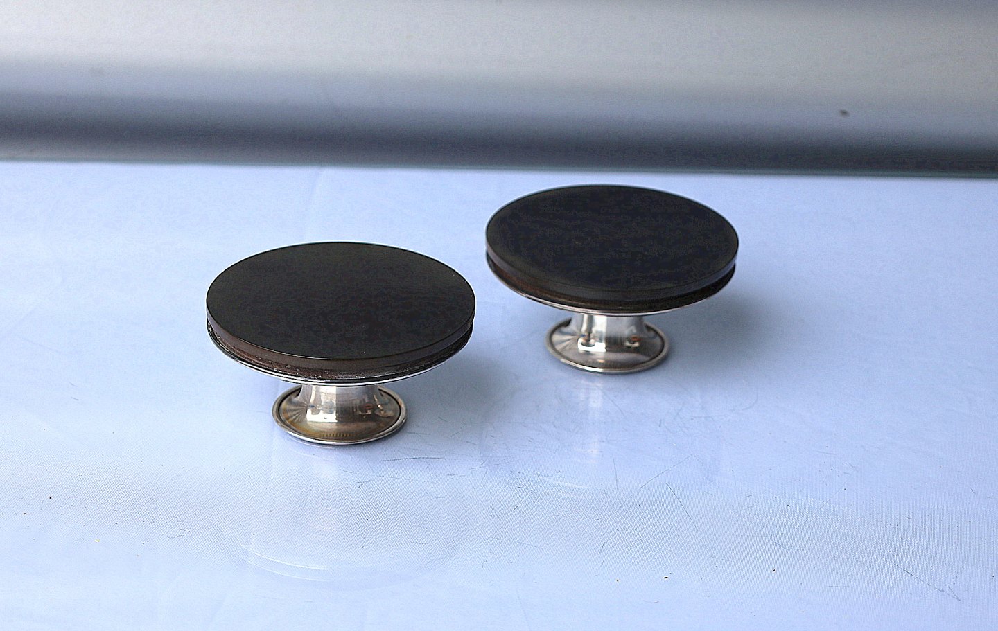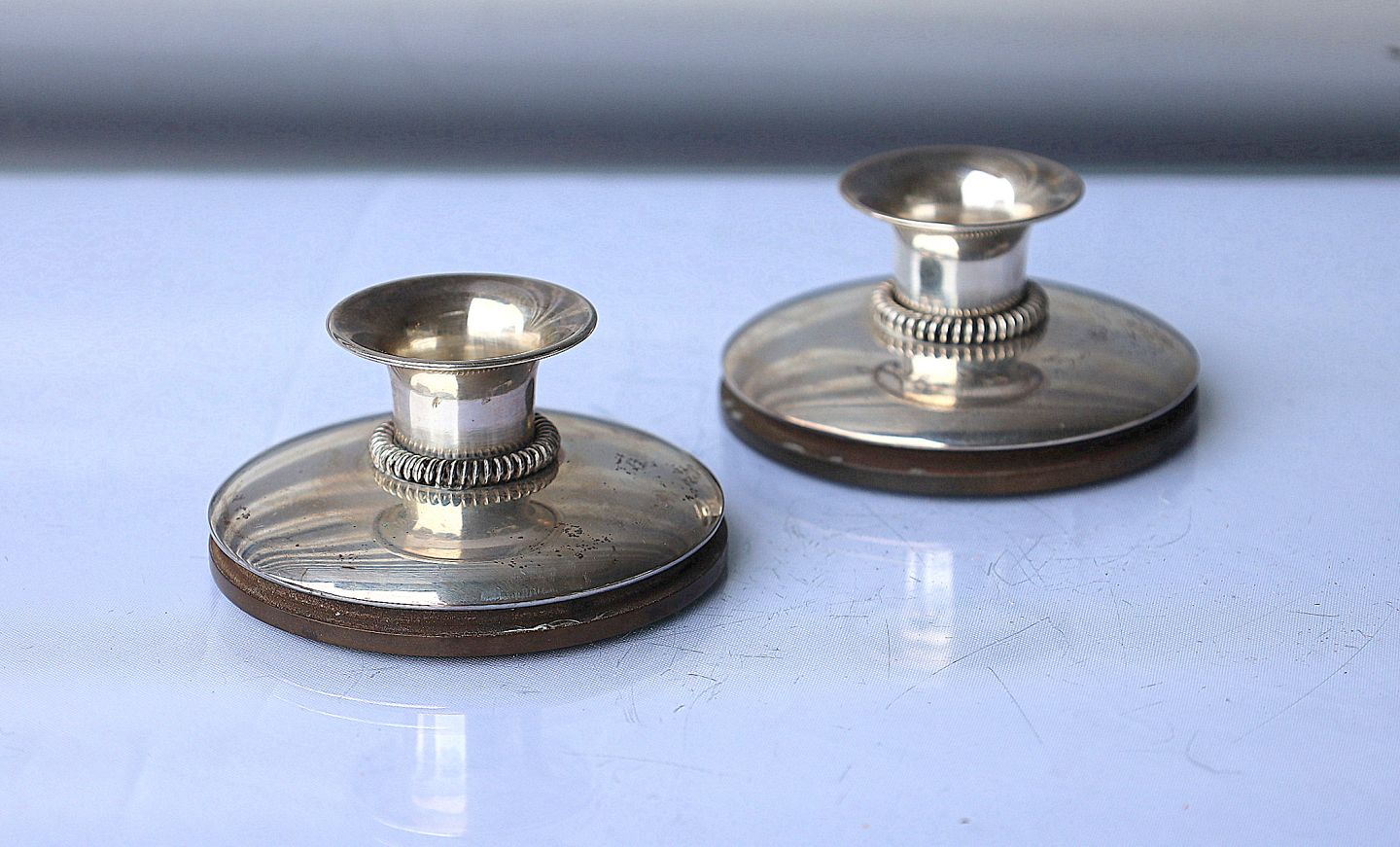 Lysestager stemplet "Silverco". "Silverco" lysestager 3-tårnet sølv, fra 1954. Lysestagerne er pyntet med en spiral. Bunden på stagerne er lavet af plastlignende materiale.