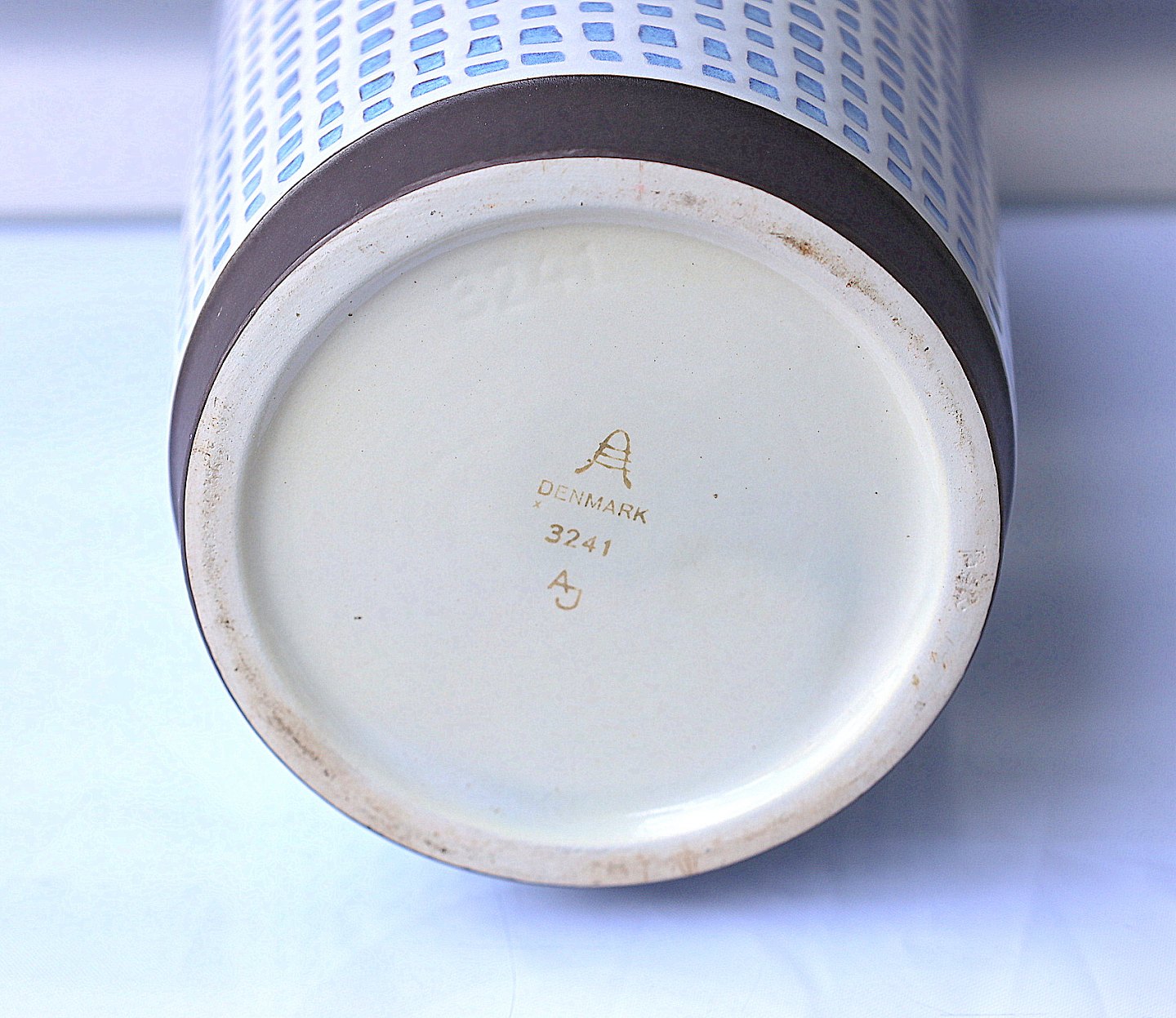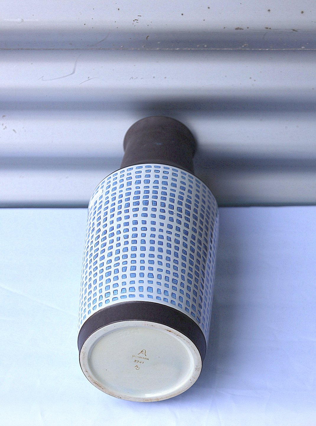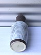 Aluminia vase nr. 3241."Thule"- vase i brunt keramik, på midten er der et geometrisk mønster i lyseblåt og hvidt. Vasen er glaseret blå indvendig.