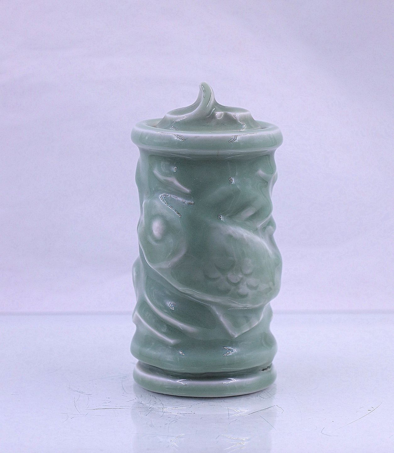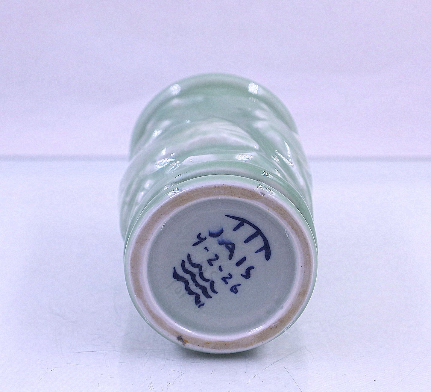 Royal Copenhagen. Jais Nielsen, låg vase. Vasen er dekoreret med fisk og grøn celadon glasur.