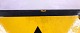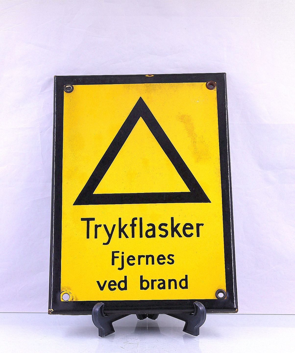 Emaljeskilt med advarsel, Trykflasker fjernes ved brand. Skiltet er gult, med sort trekant og sort tekst.