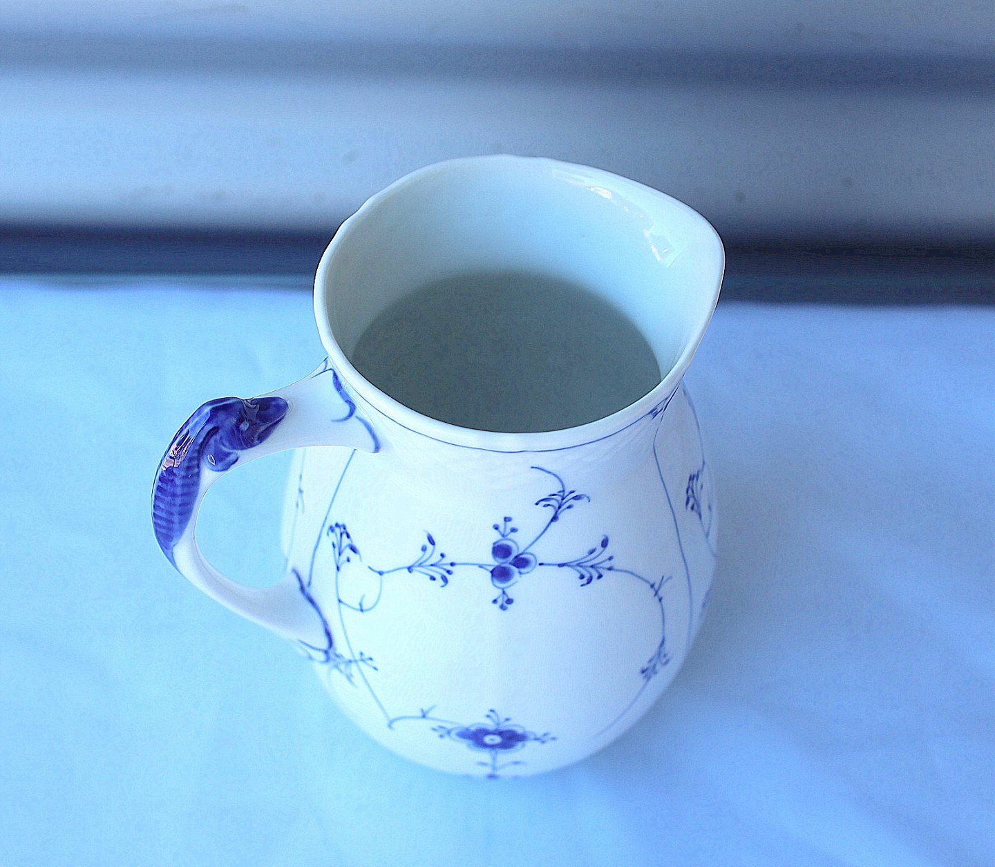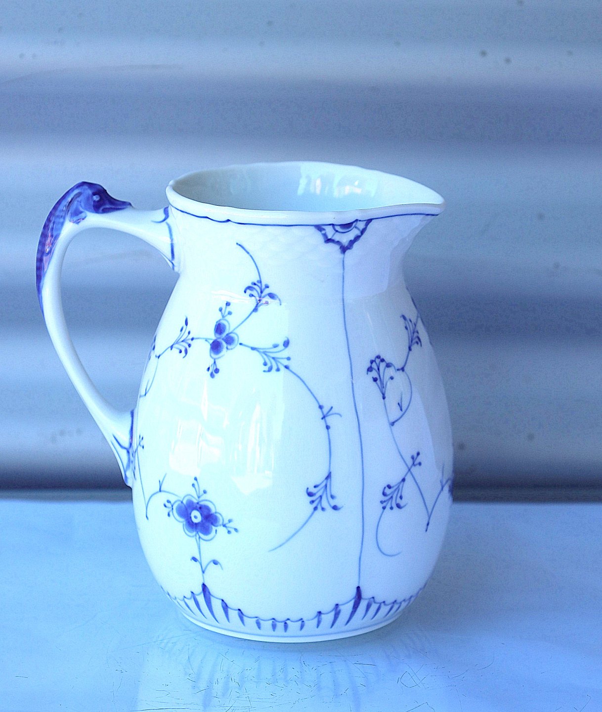 Bing & Grøndahl, musselmalet kande nr. 85. Kanden er hvidt porcelæn, med blåmalet mønster.