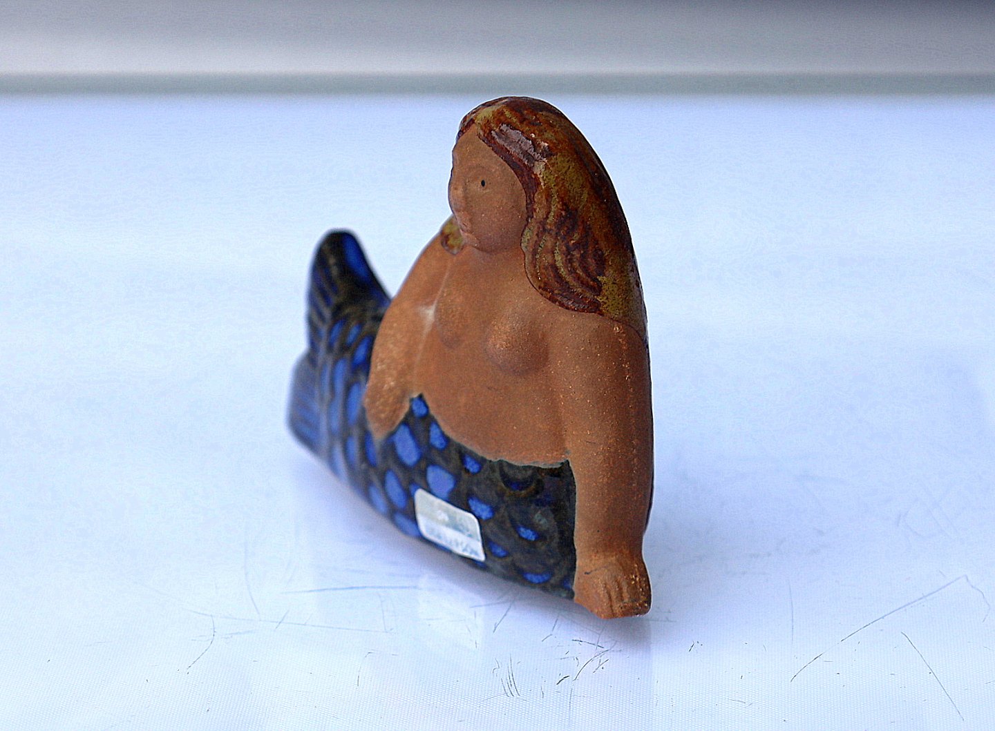 Lisa Larson, Gustavsberg. Keramik Havfrue. Havfruen har blå hale med lyseblå prikker, Havfruen har langt hår. Havfruen er fremstillet Gustavsberg, Sverige fra 1963.