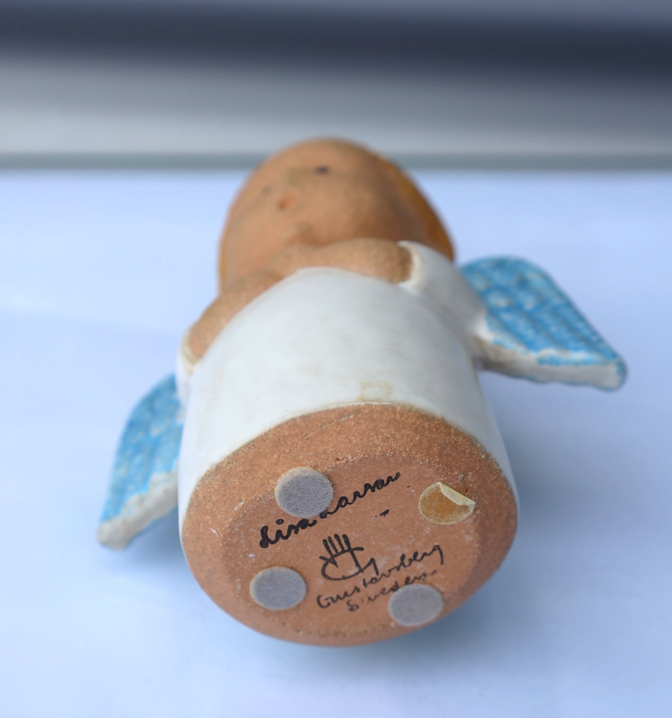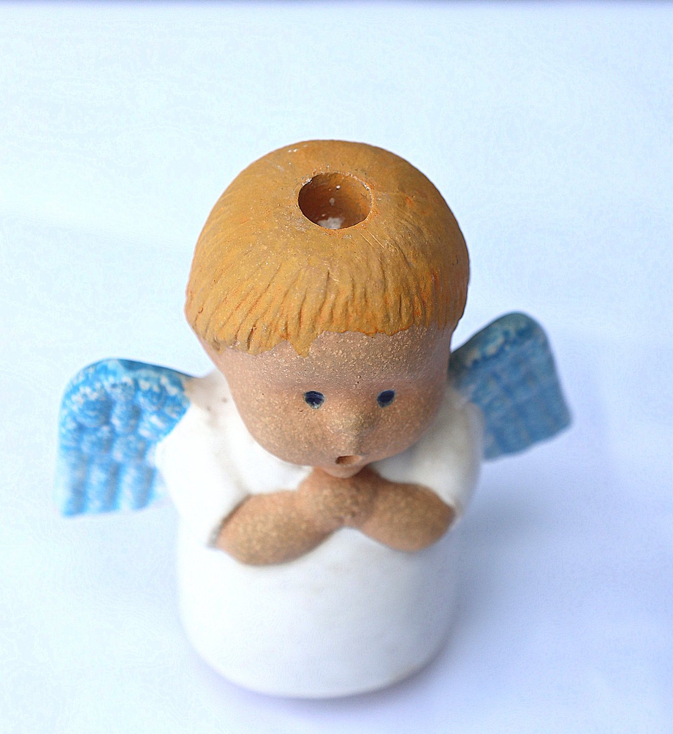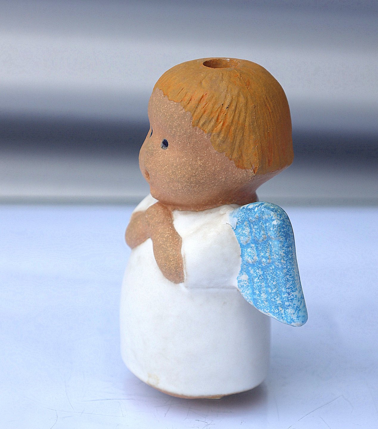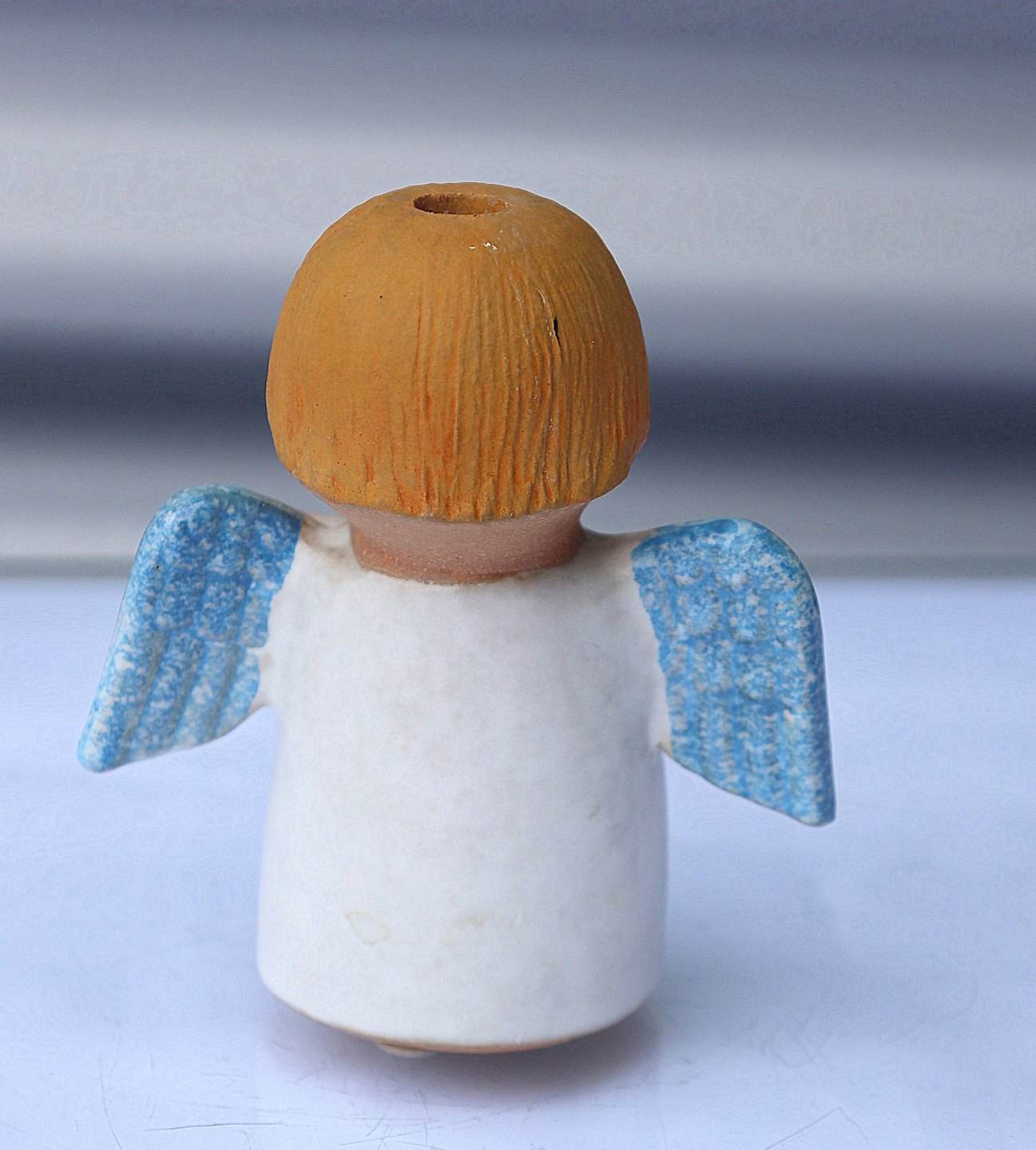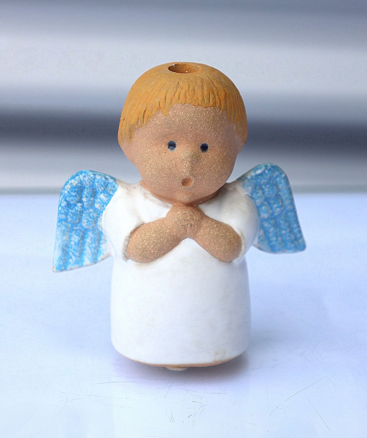 The Angel Children series: Angela, Keramik Engel med blå vinger. Englen er med hvide vinger og klædt i hvidt tøj, Englen har lyst hår. I toppen af hovedet er der beregnet til et kertelys.