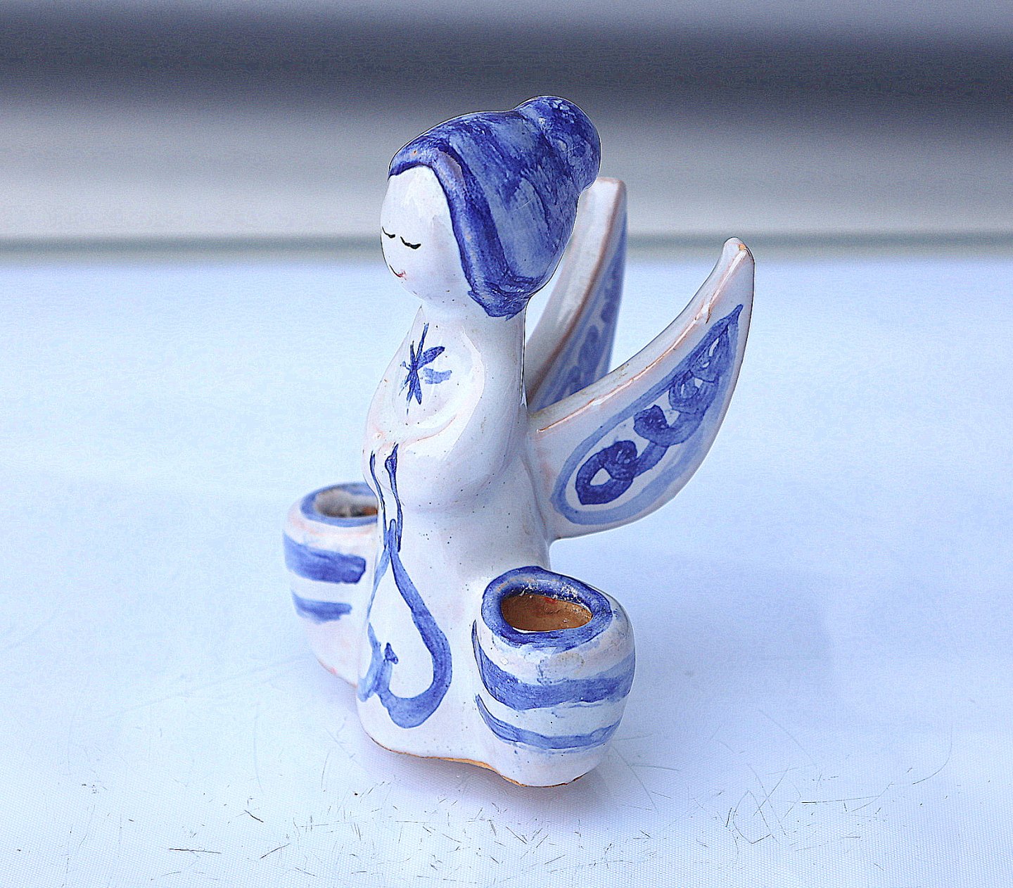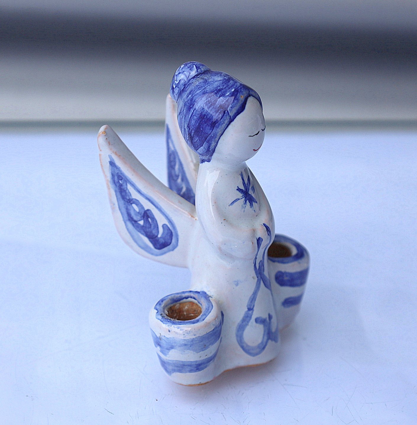 Keramik engel. Dameenglen er til 2 kertelys. Englen er holdt i blå og hvide farver. Dameenglen er håndmalet.