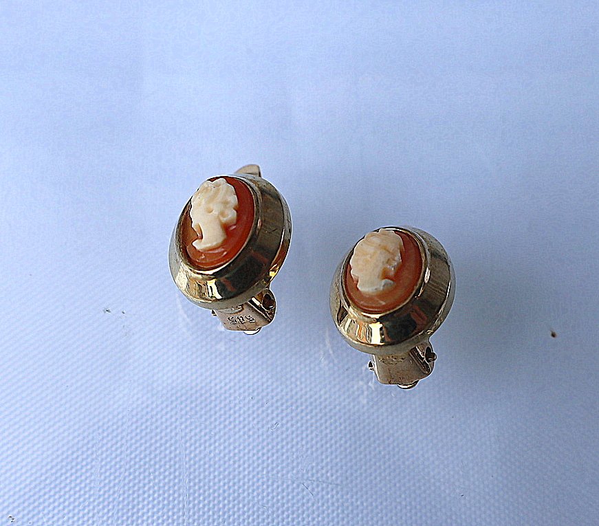 Guld, Came øreclips. Came øreclips, der er indfattet i guld, 585 guld. Cameen er udskåret af en 2-farvet konkylie.
