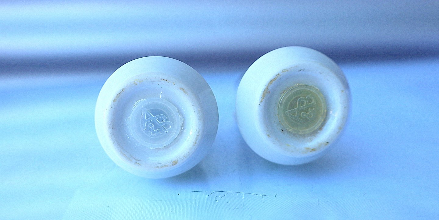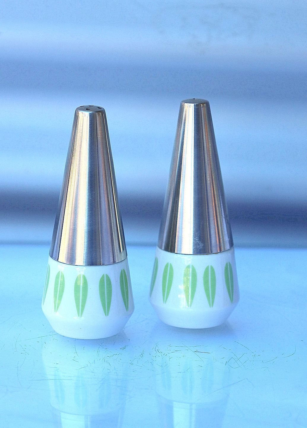 Lyngby Danild salt-og pebersæt, i Lotus- serien. Sættet er med top af stål og nederst, porcelæn med grøn Lotus dekoration.